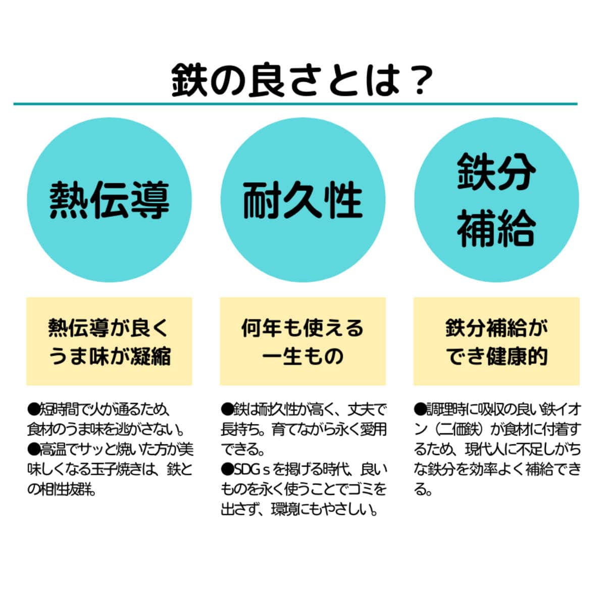 鉄製は熱伝導が良く、短時間で火が通るため食材の旨味を閉じ込め、美しい焼き色の卵焼きに仕上がります。