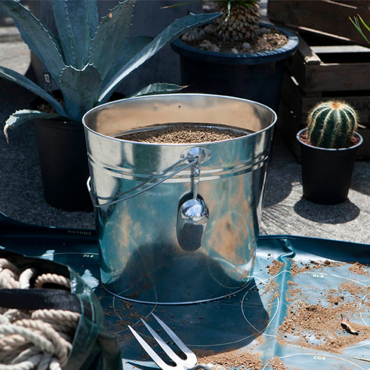 用土をブレンドしたり、植物の植え替えをする時に重宝するガーデニング用バケツです。 ガルバナイズド仕上げならではの無骨さに思わず目を奪われます。 土を直接バケツに入れてガシガシ使うのはもちろん、オーバル型なので、購入した用土を袋ごとストックすることも可能です。