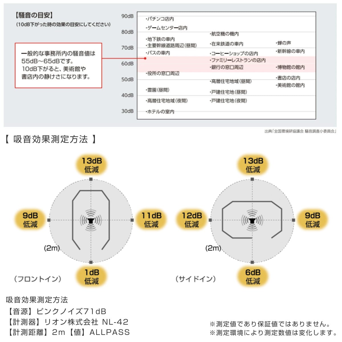 一般的な事務所内の騒音値は55dB~65dBです。10dB下がると、美術館や書店内の静けさになります。