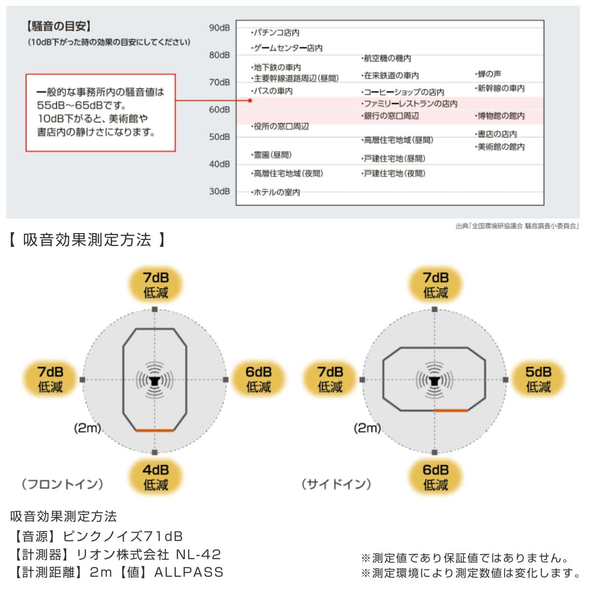 一般的な事務所内の騒音値は55dB~65dBです。10dB下がると、美術館や書店内の静けさになります。