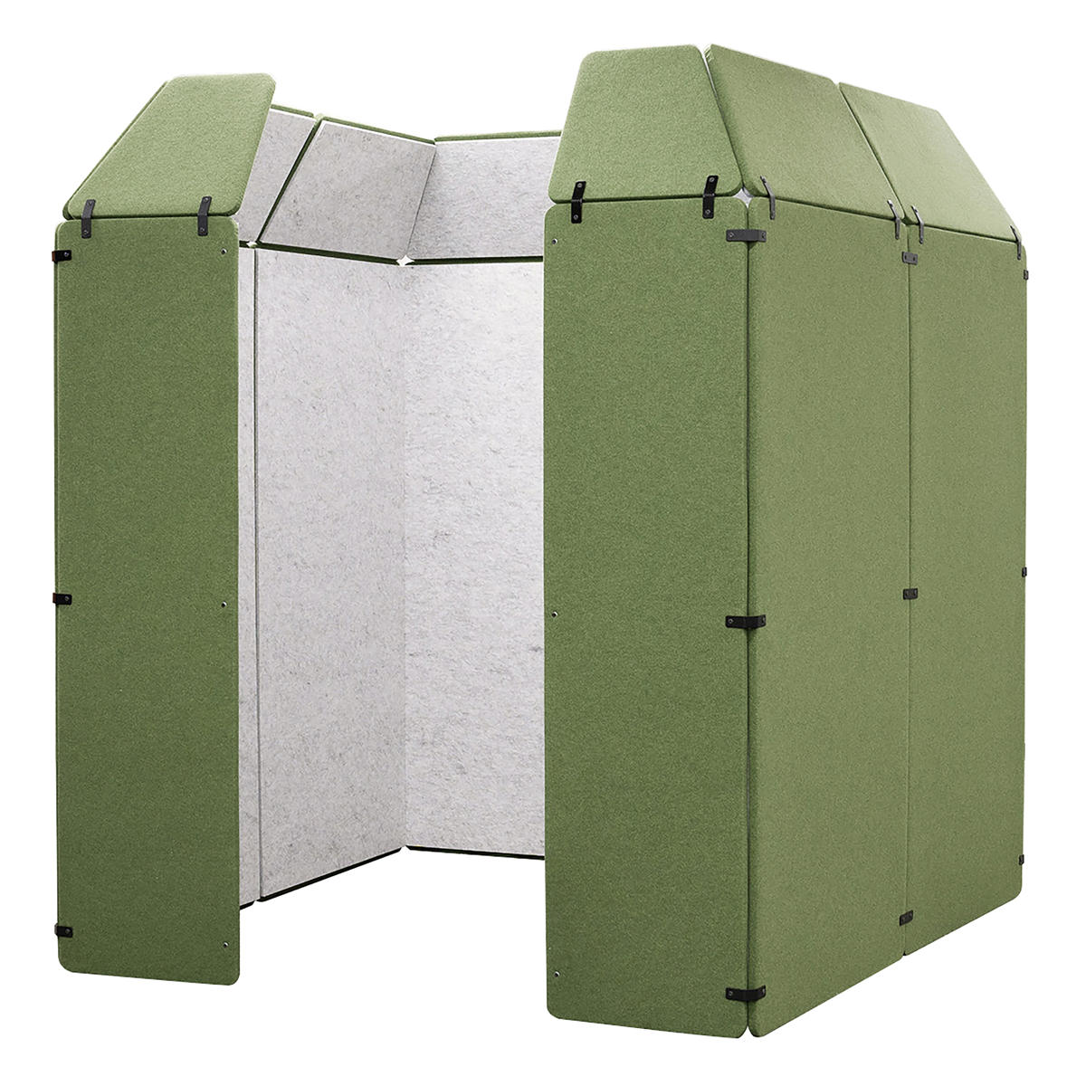 2人での打ち合わせができる『リミュートシリーズ』のミーティング用吸音パーテーションです。吸音効果の高いミーティングスペースを、簡単に組み立てて設置することができます。天面と出入口が開いたタイプなので、閉塞感なく、快適にお使いいただけます。