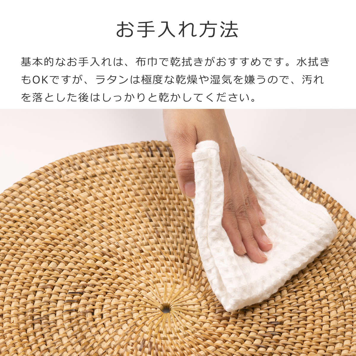 基本的なお手入れは、布巾で乾拭きがおすすめです。水拭きもOKですが、ラタンは極度な乾燥や湿気を嫌うので、汚れを落とした後はしっかりと乾かしてください。また、編み込み部分など溜まってしまったホコリなどは、柔らかいブラシを使って優しく除去しましょう。