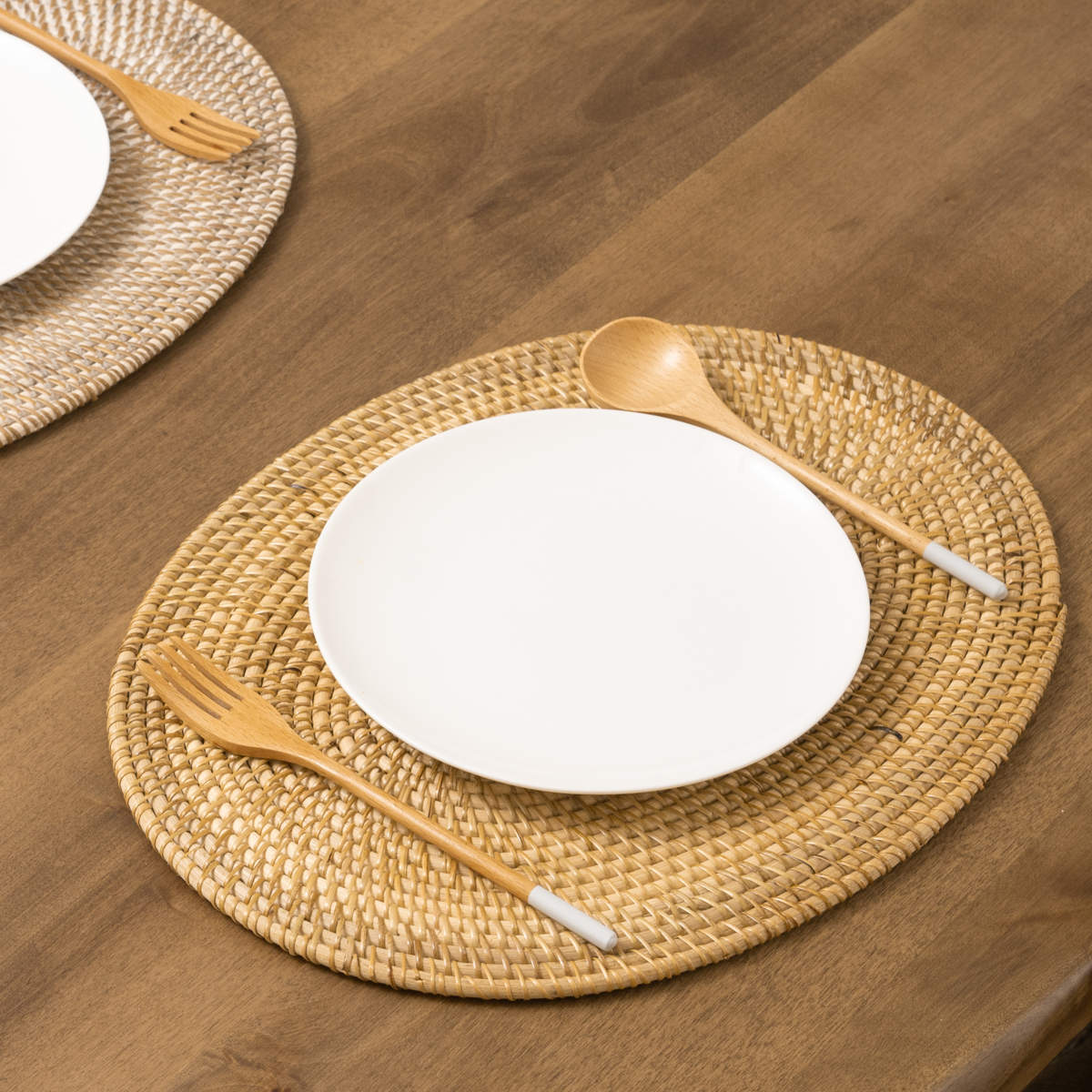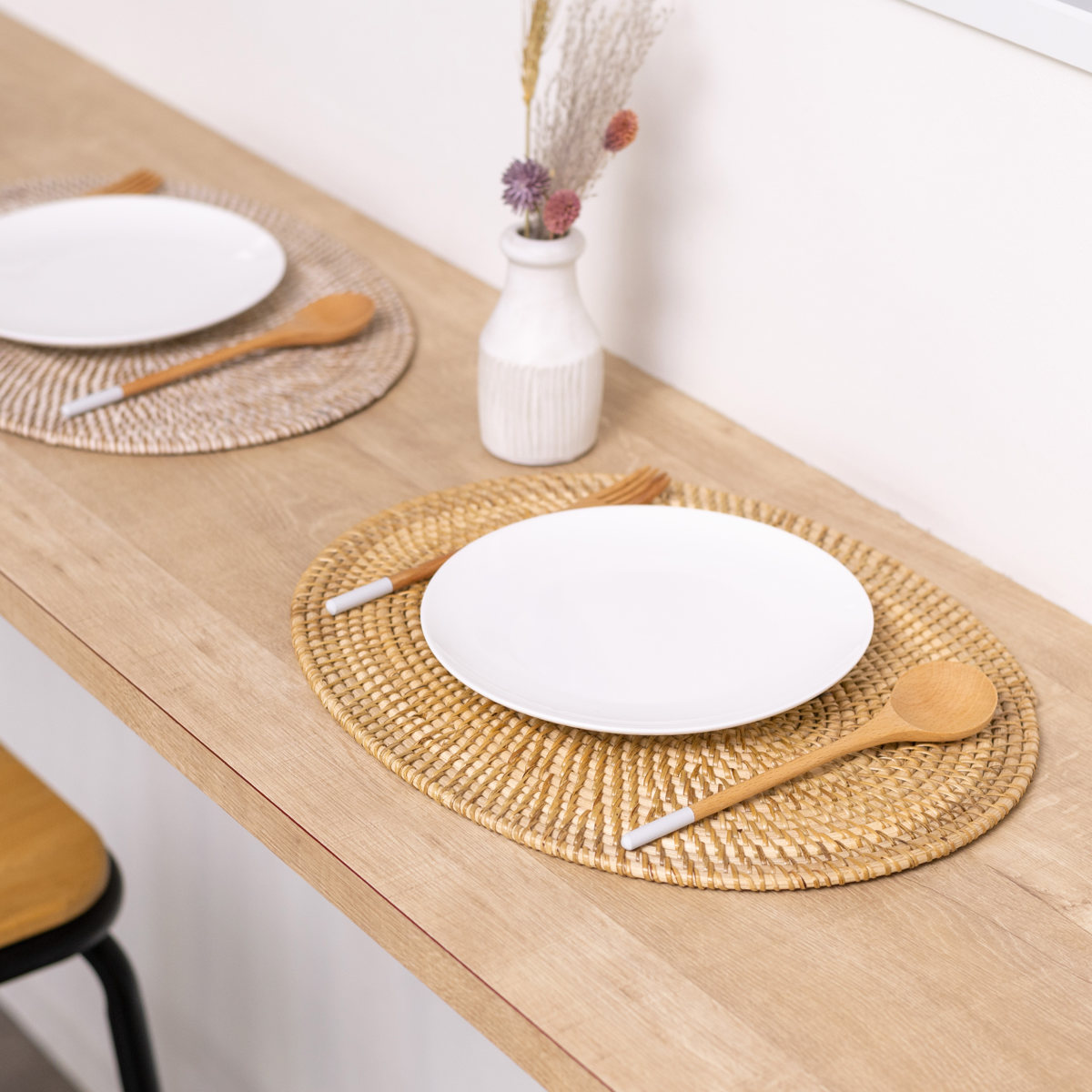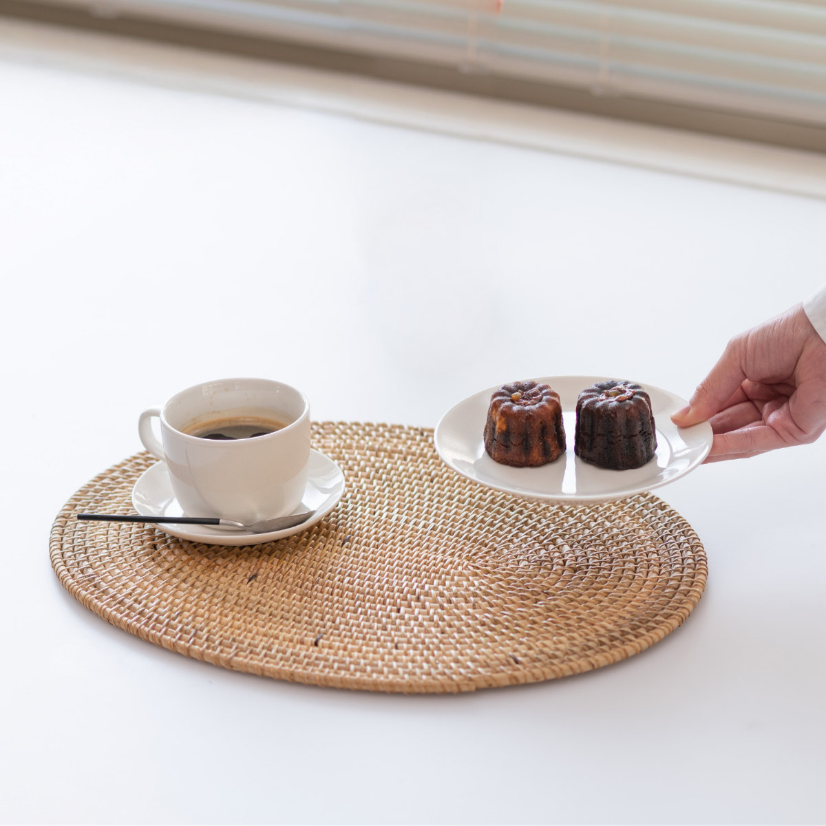 軽量でありながらしっかりとした硬さのあるラタン素材のプレイスマットです。手作業で丁寧に編み込まれた丈夫な作りになっており、いつもの食卓にプラスするだけで料理や器が引き立ち、特別感のあるテーブルコーディネートに仕上がります。