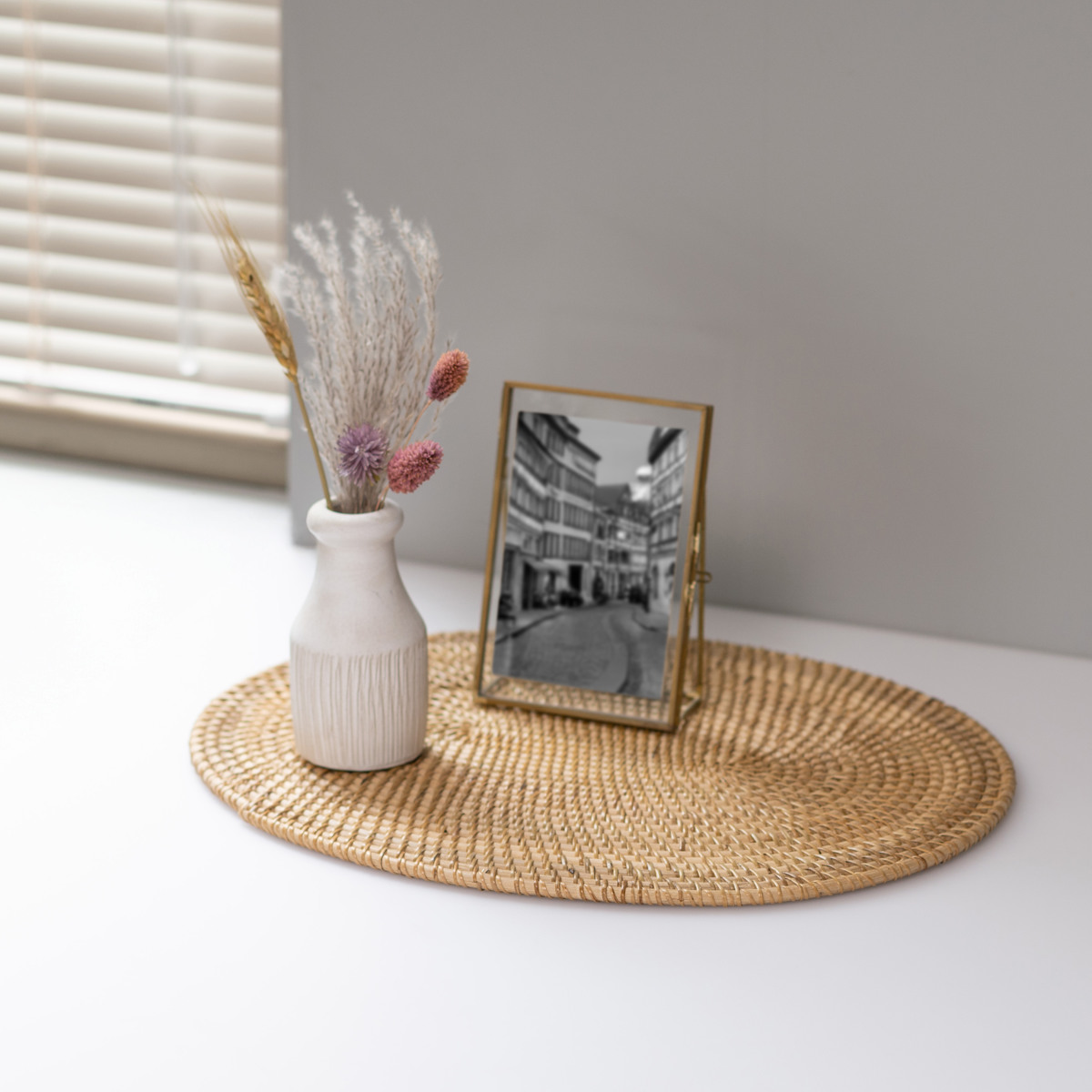 食卓だけでなく、フラワーベースやフォトフレームなどを飾るディスプレイトレイとしてもおすすめです。お気に入りをそのまま飾るよりも、こなれた雰囲気を作ることができます。ハンドメイドならではの温かみや、ラタン素材の優しい風合いをぜひ感じてみてください。