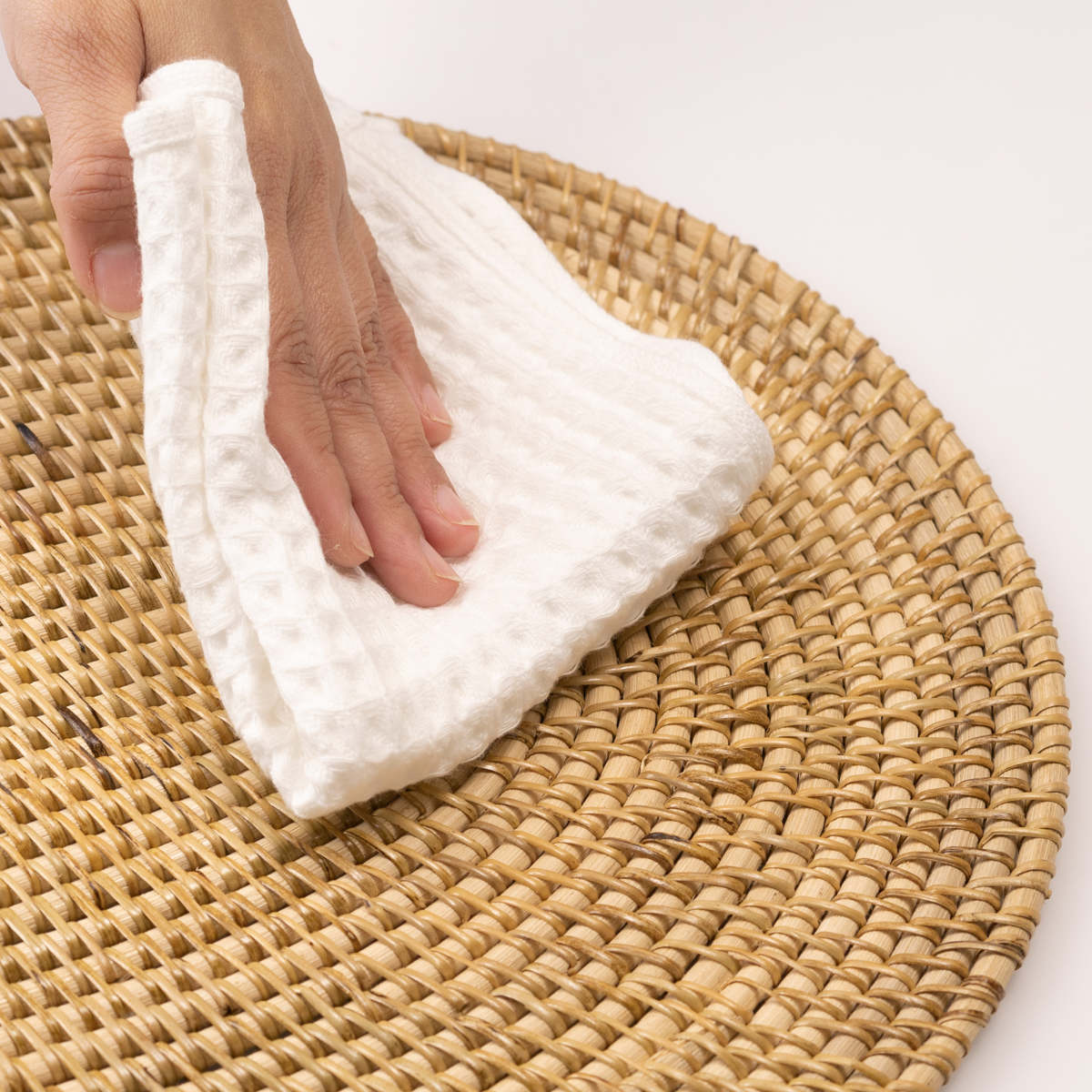 基本的なお手入れは、布巾で乾拭きがおすすめです。水拭きもOKですが、ラタンは極度な乾燥や湿気を嫌うので、汚れを落とした後はしっかりと乾かしてください。また、編み込み部分など溜まってしまったホコリなどは、柔らかいブラシを使って優しく除去しましょう。