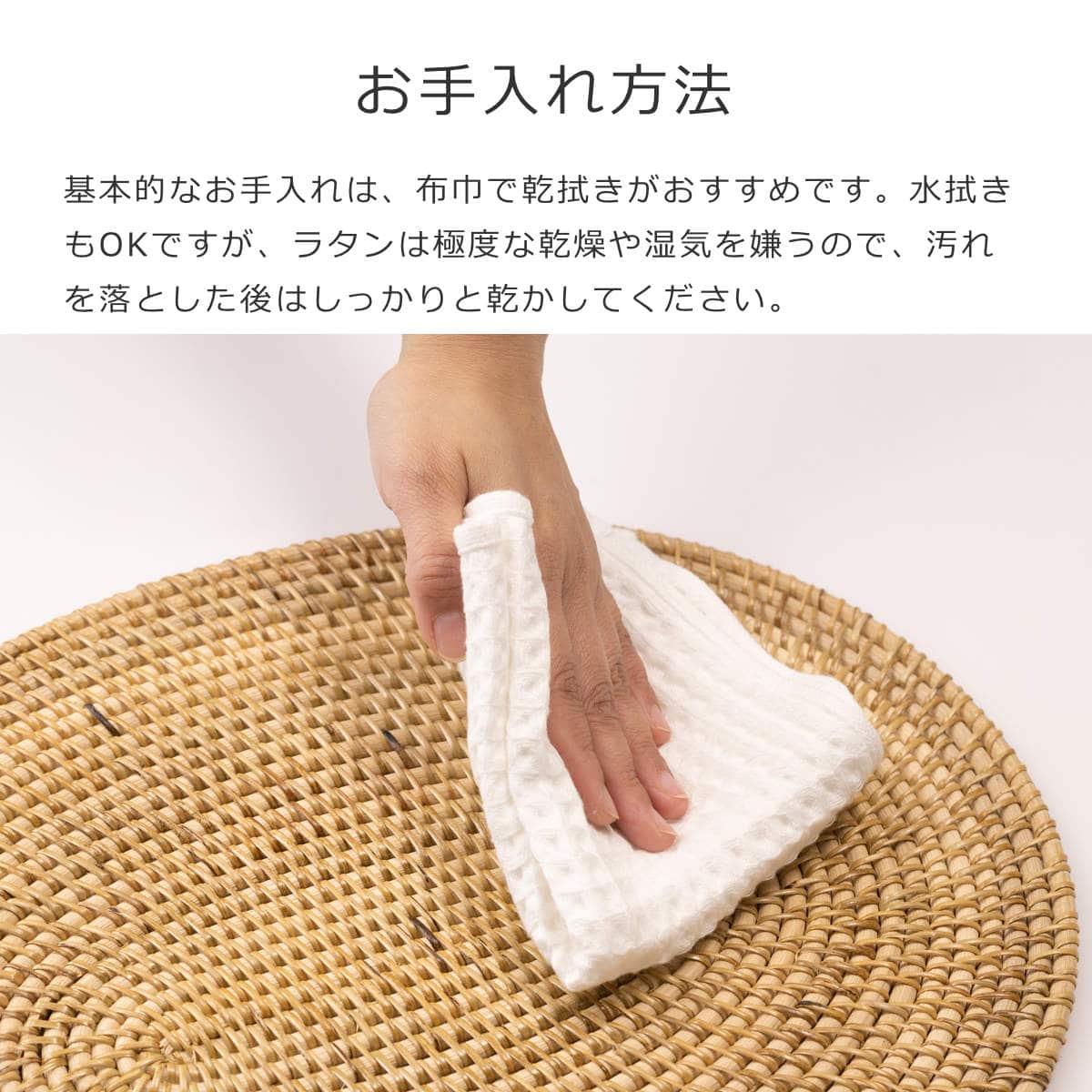 基本的なお手入れは、布巾で乾拭きがおすすめです。水拭きもOKですが、ラタンは極度な乾燥や湿気を嫌うので、汚れを落とした後はしっかりと乾かしてください。また、編み込み部分など溜まってしまったホコリなどは、柔らかいブラシを使って優しく除去しましょう。