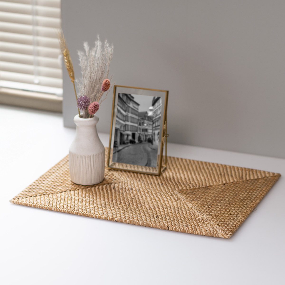 食卓だけでなく、フラワーベースやフォトフレームなどを飾るディスプレイトレイとしてもおすすめです。お気に入りをそのまま飾るよりも、こなれた雰囲気を作ることができます。ハンドメイドならではの温かみや、ラタン素材の優しい風合いをぜひ感じてみてください。