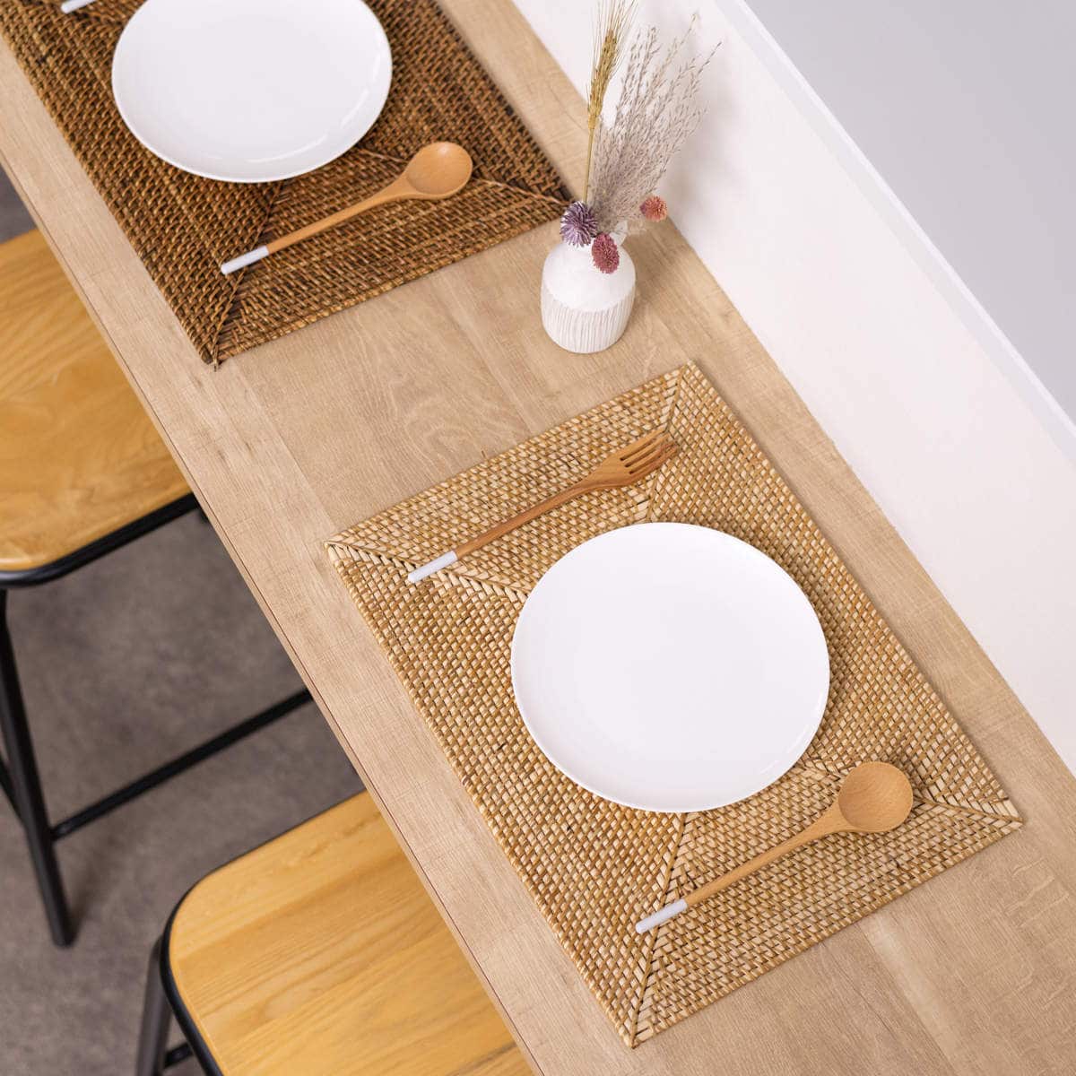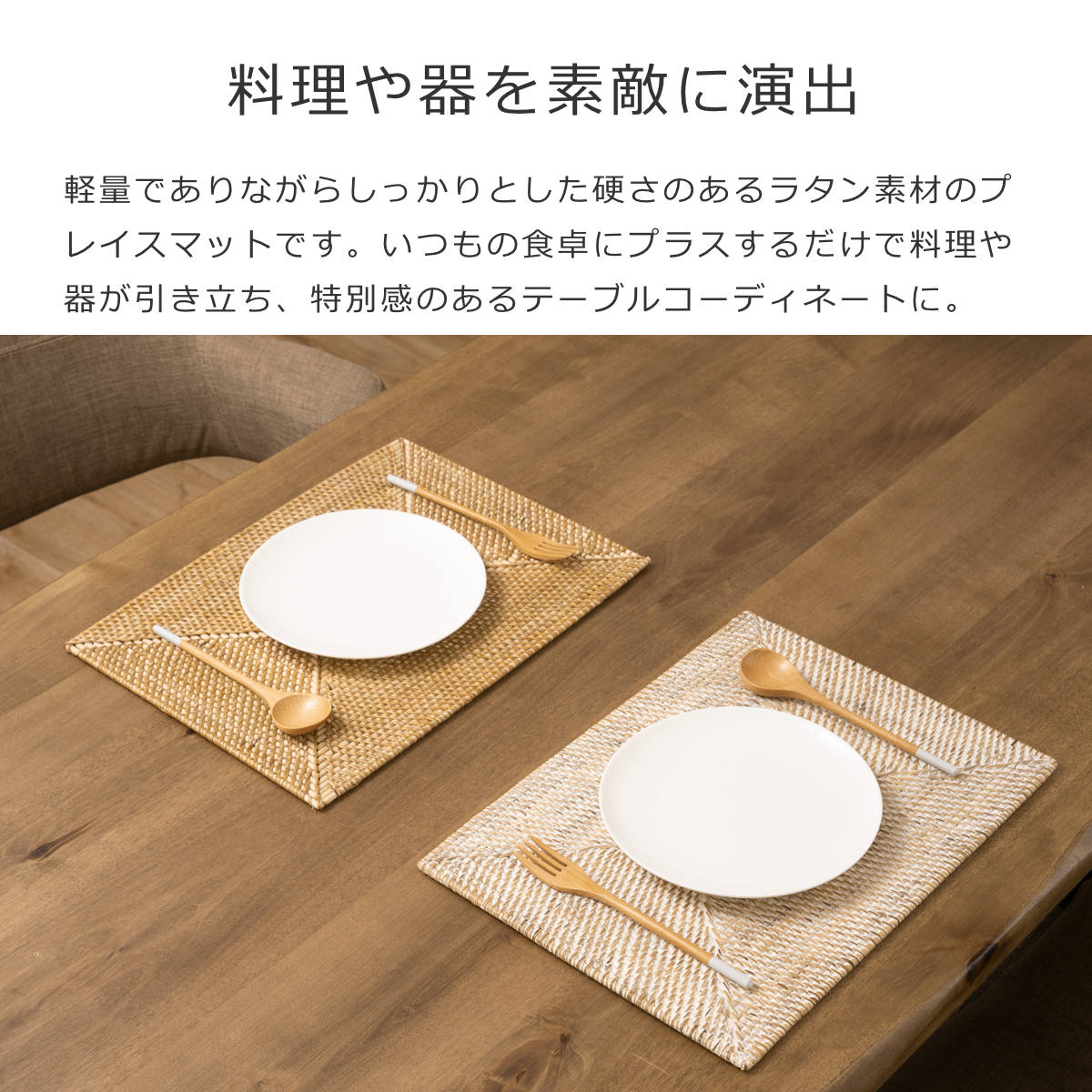 軽量でありながらしっかりとした硬さのあるラタン素材のプレイスマットです。手作業で丁寧に編み込まれた丈夫な作りになっており、いつもの食卓にプラスするだけで料理や器が引き立ち、特別感のあるテーブルコーディネートに仕上がります。