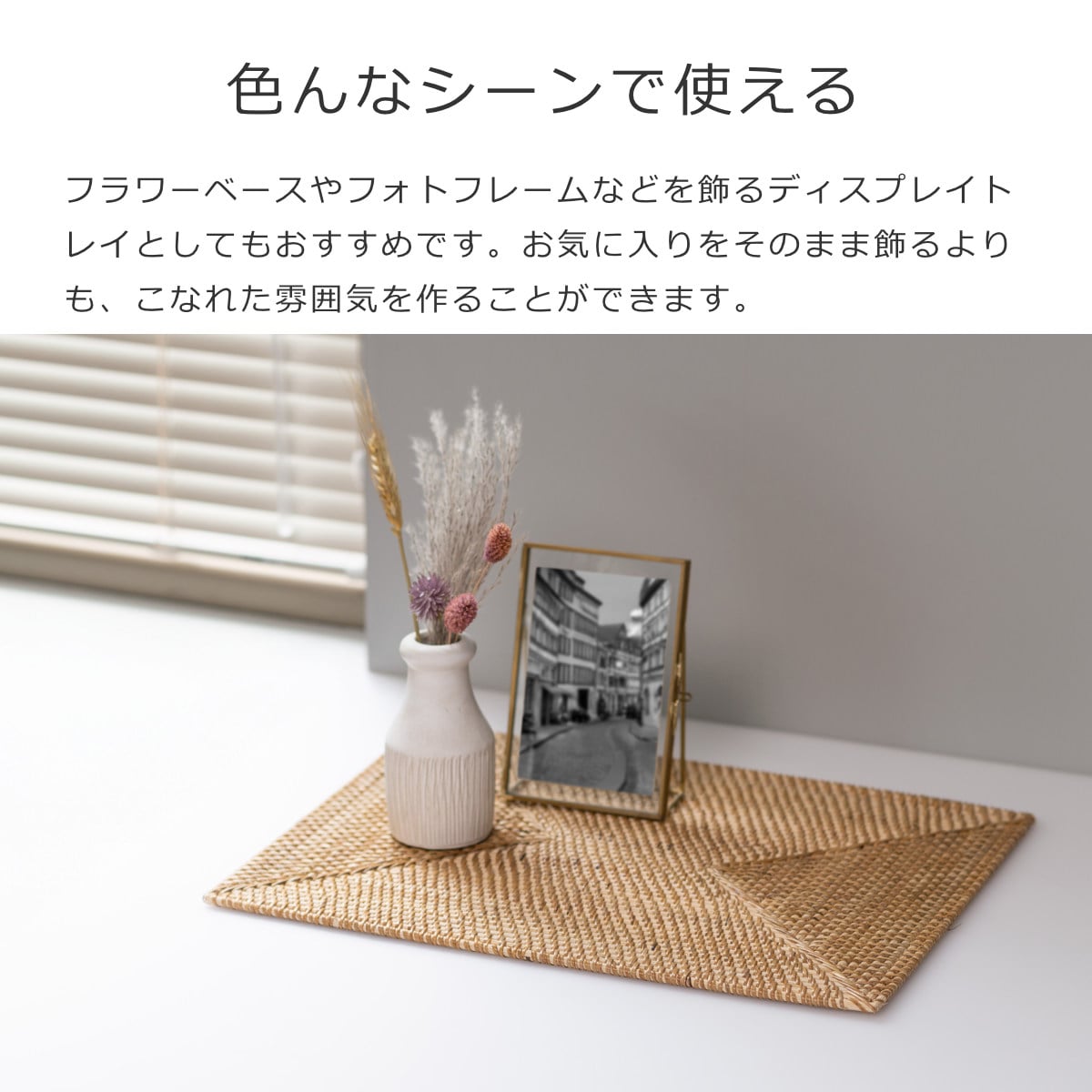 食卓だけでなく、フラワーベースやフォトフレームなどを飾るディスプレイトレイとしてもおすすめです。お気に入りをそのまま飾るよりも、こなれた雰囲気を作ることができます。ハンドメイドならではの温かみや、ラタン素材の優しい風合いをぜひ感じてみてください。