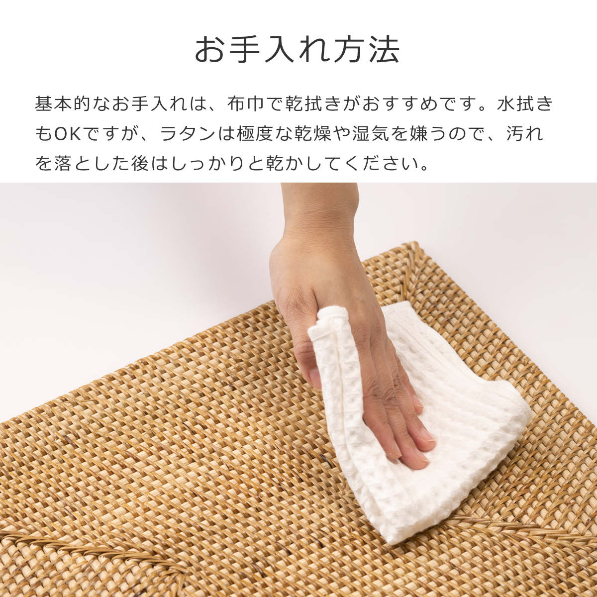 基本的なお手入れは、布巾で乾拭きがおすすめです。水拭きもOKですが、ラタンは極度な乾燥や湿気を嫌うので、汚れを落とした後はしっかりと乾かしてください。また、編み込み部分など溜まってしまったホコリなどは、柔らかいブラシを使って優しく除去しましょう。