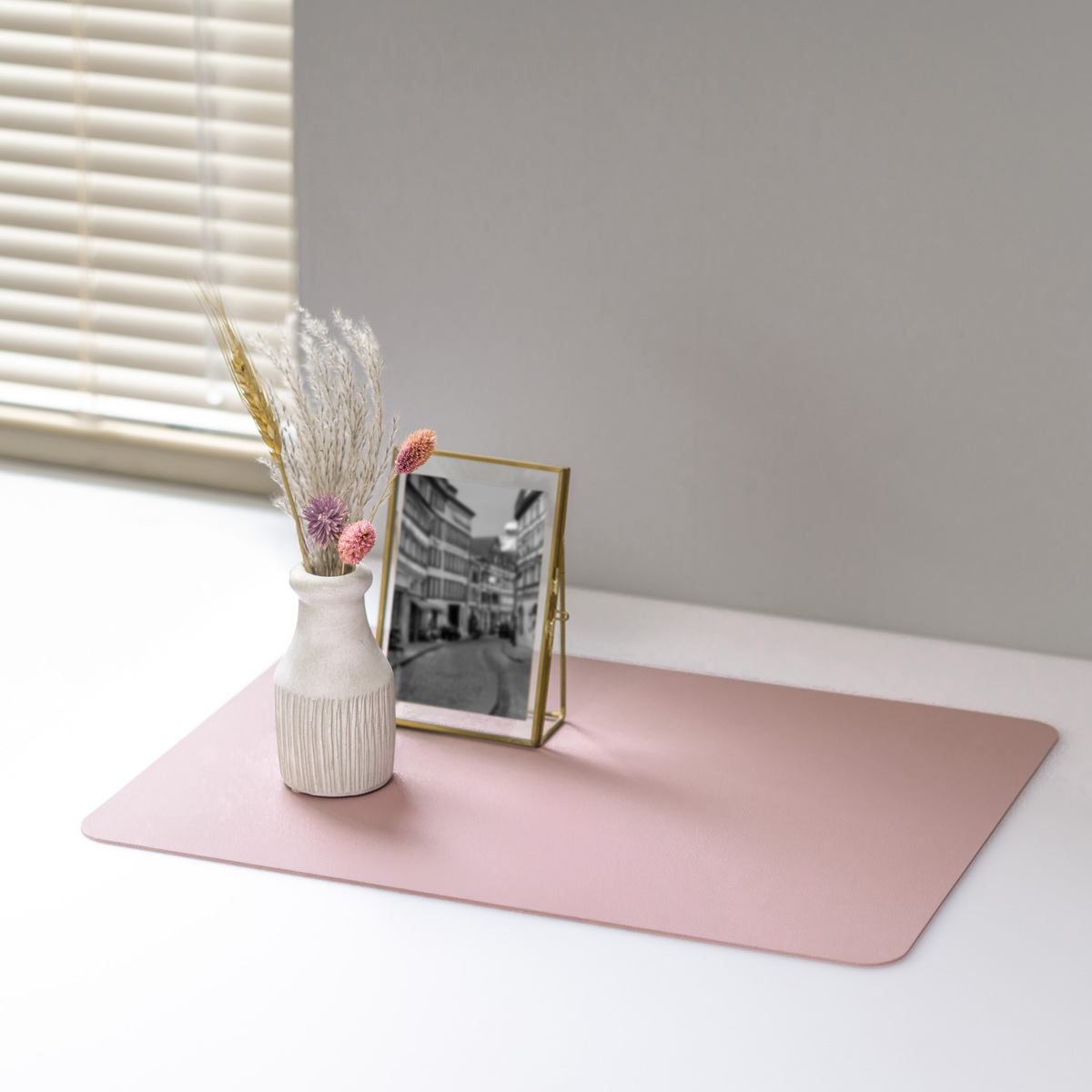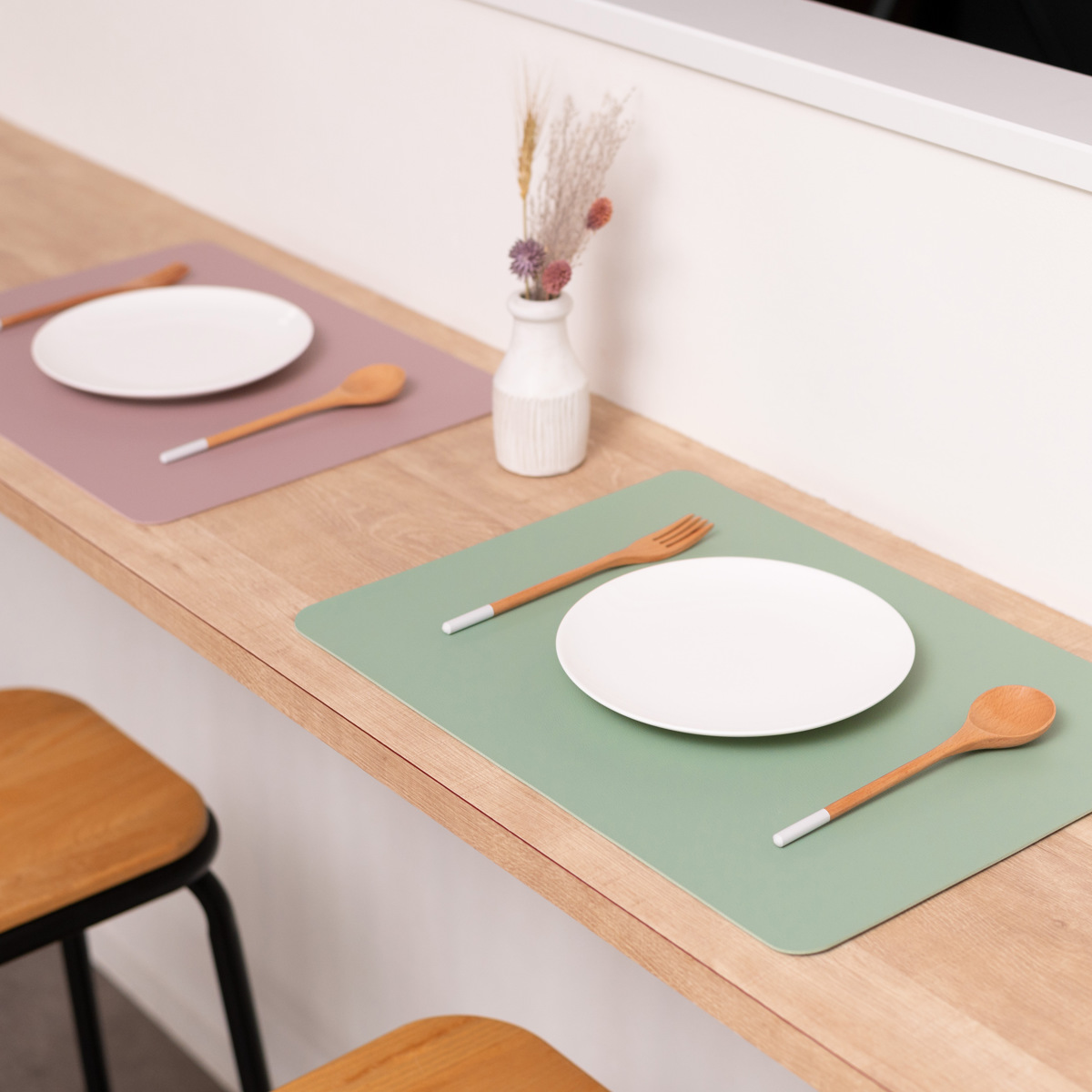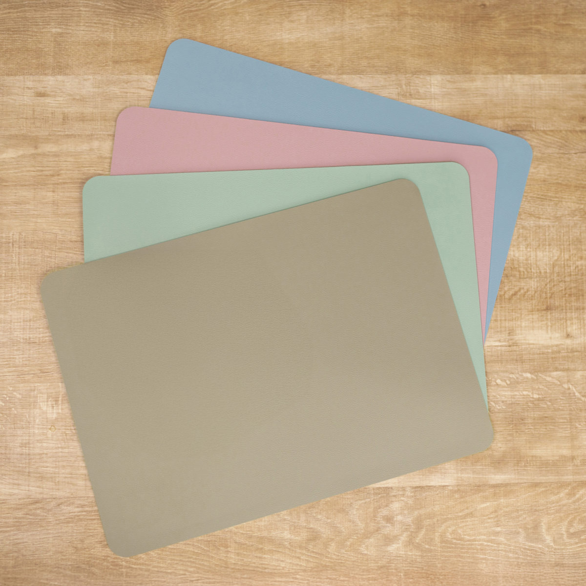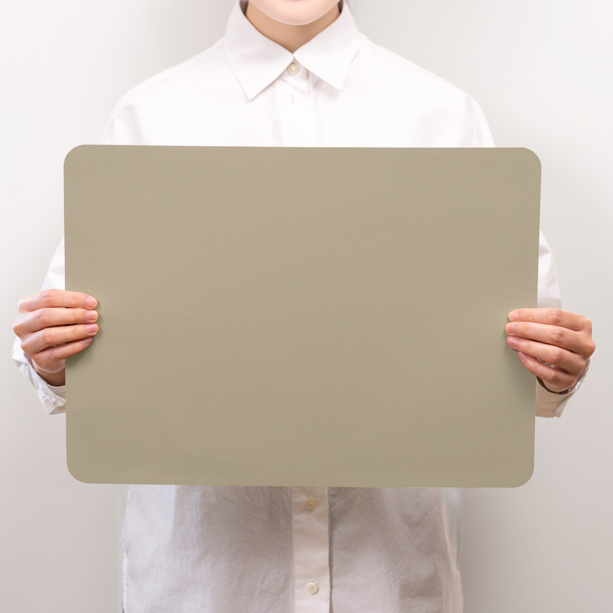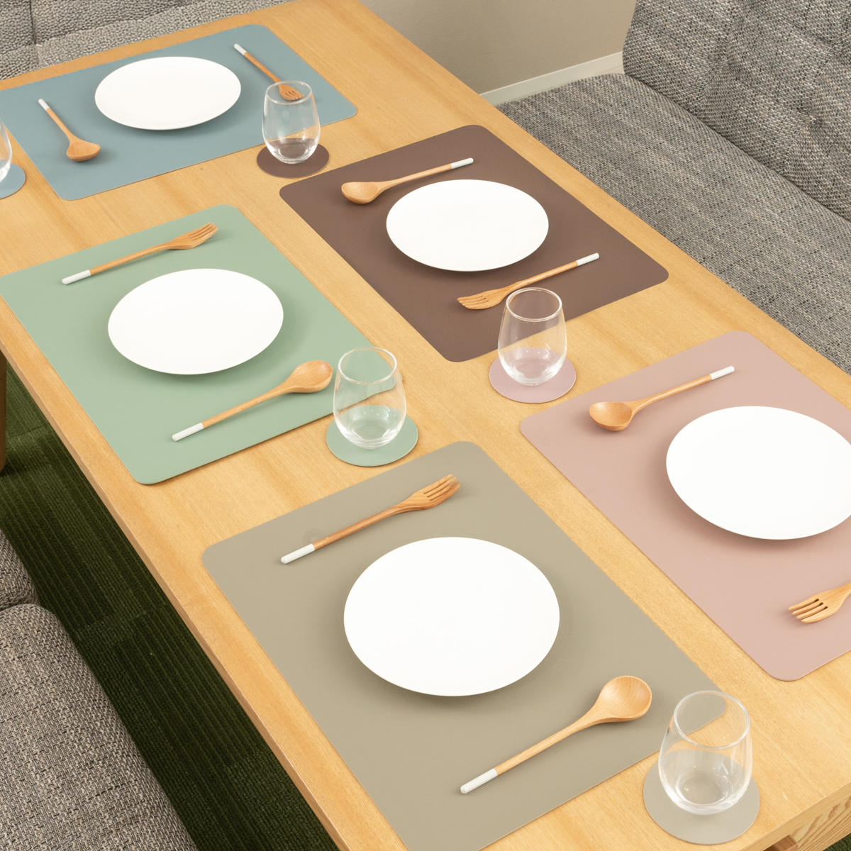 柔らかいレザーのような質感と、少しくすみのある上品なニュアンスカラーを組み合わせたプレイスマットです。いつもの食卓にプラスするだけで料理や器が引き立ち、テーブルコーディネートがより華やかになります。