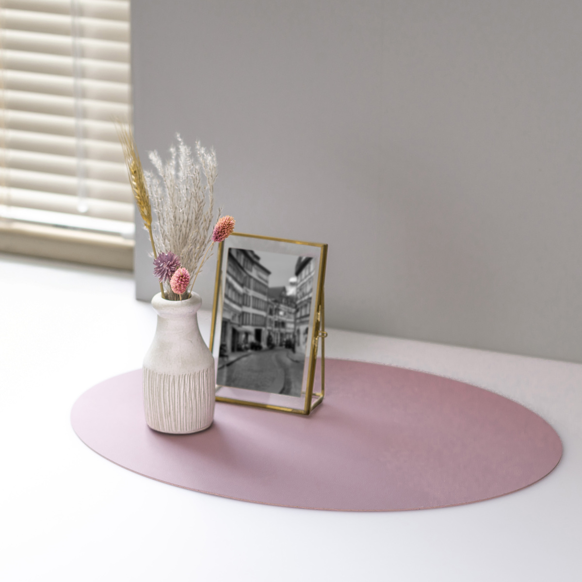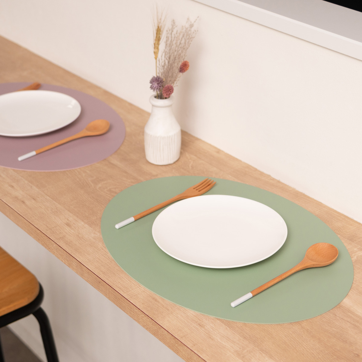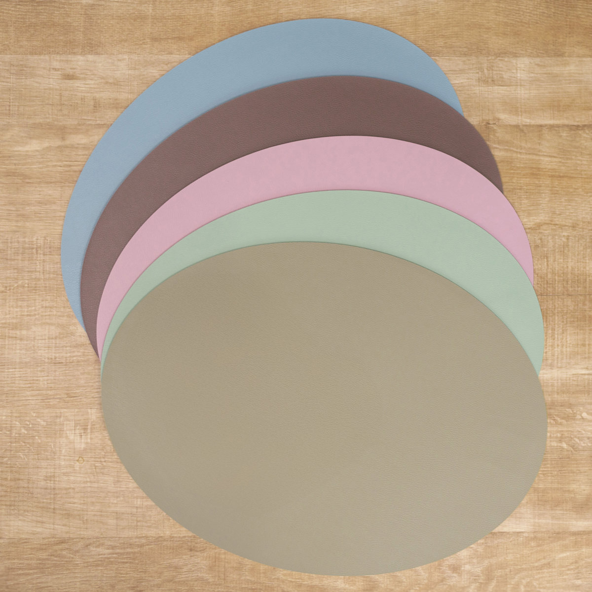 柔らかいレザーのような質感と、少しくすみのある上品なニュアンスカラーを組み合わせたプレイスマットです。いつもの食卓にプラスするだけで料理や器が引き立ち、テーブルコーディネートがより華やかになります。