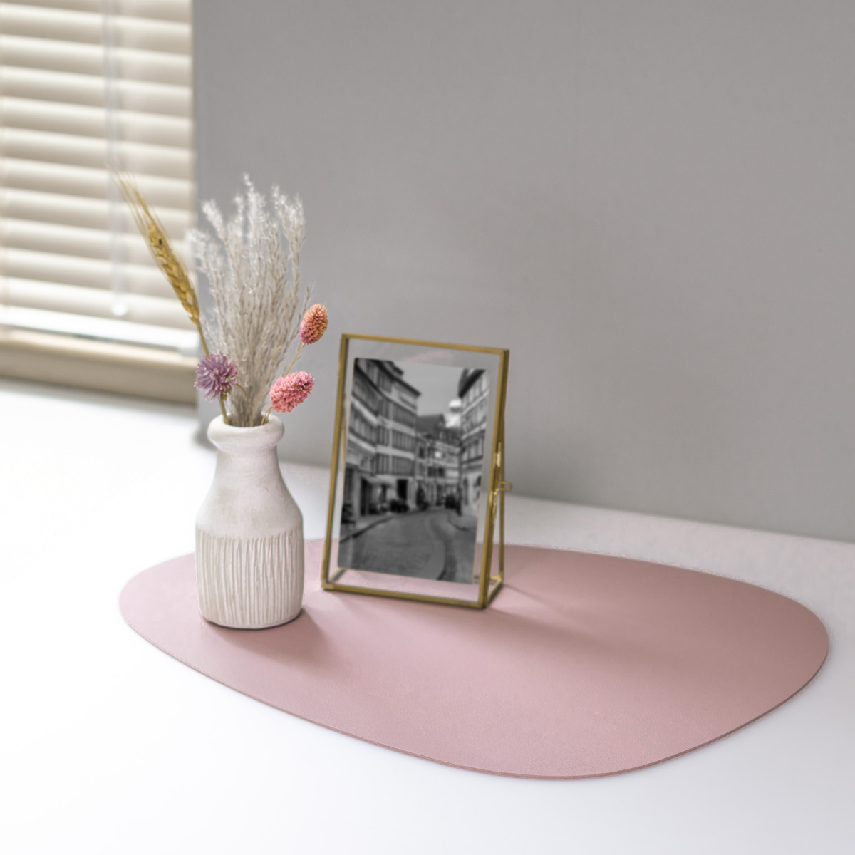 食卓だけでなく、フラワーベースやフォトフレームなどを飾るディスプレイトレイとしてもおすすめです。くすみがかったスモーキーカラーと、角のない丸みを帯びたデザインが優しい印象を与えてくれるので、リビングや寝室、玄関など色んなシーンで使えます。