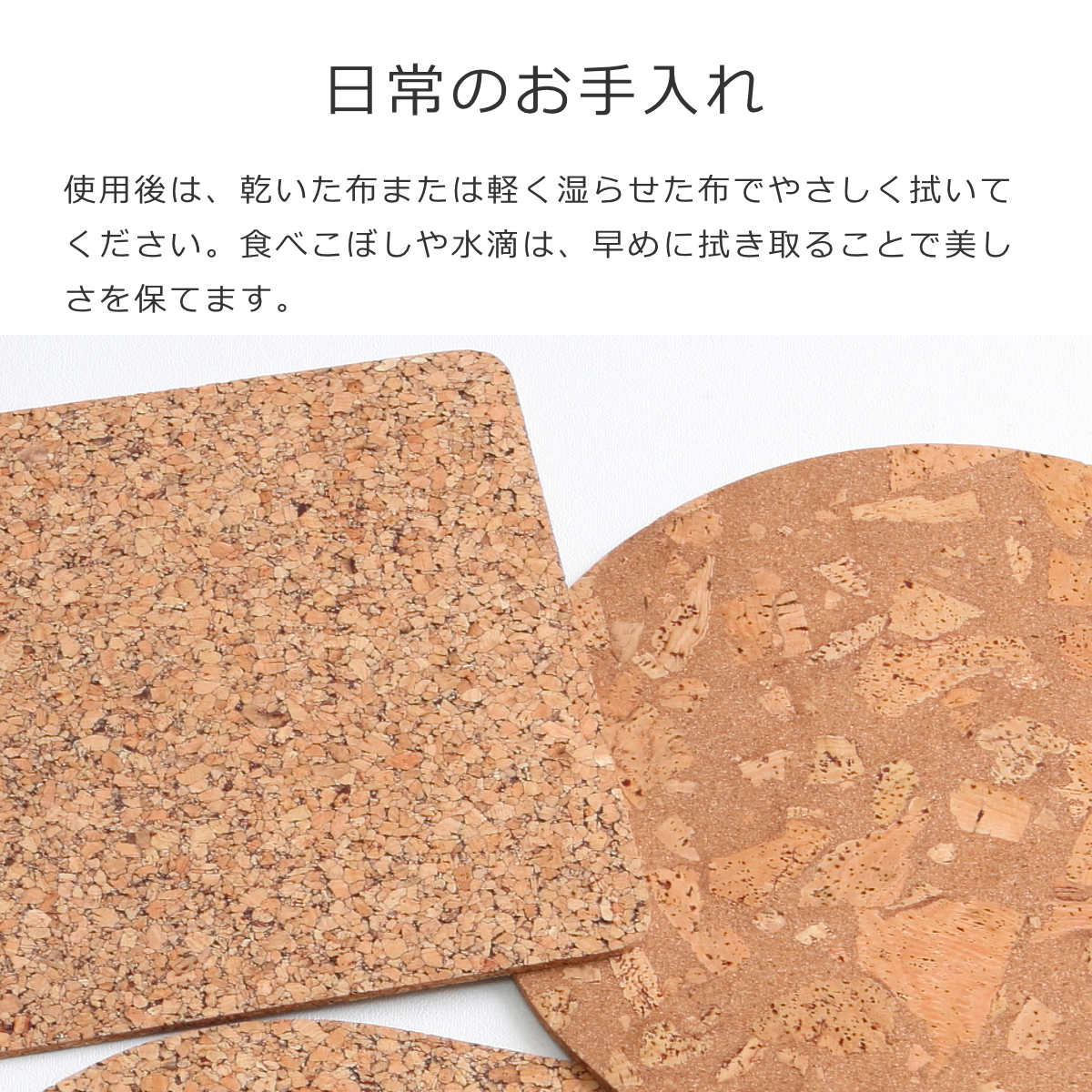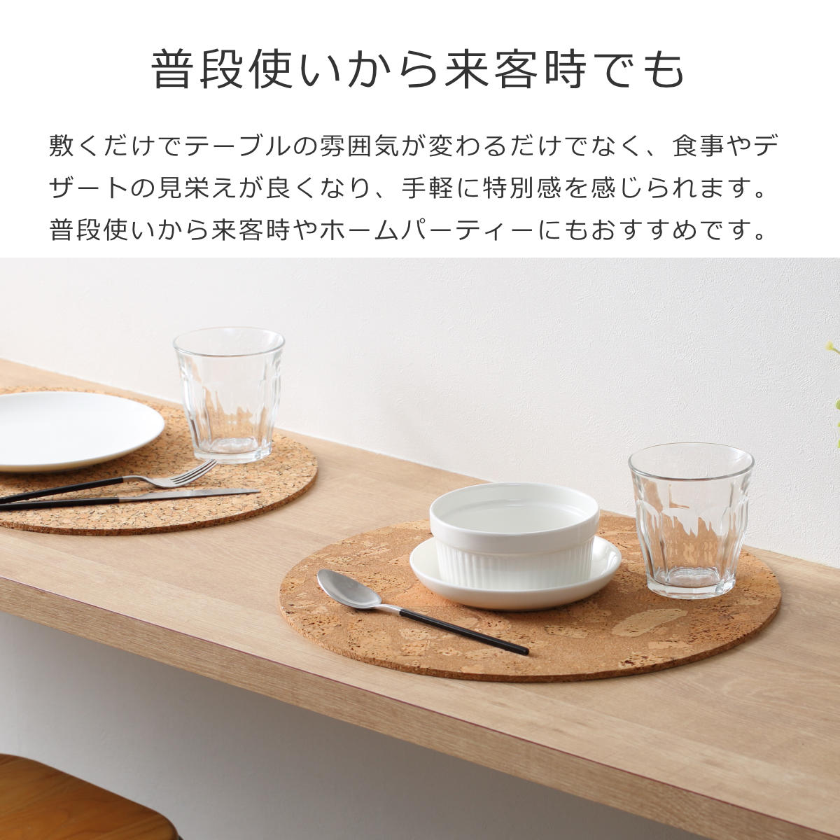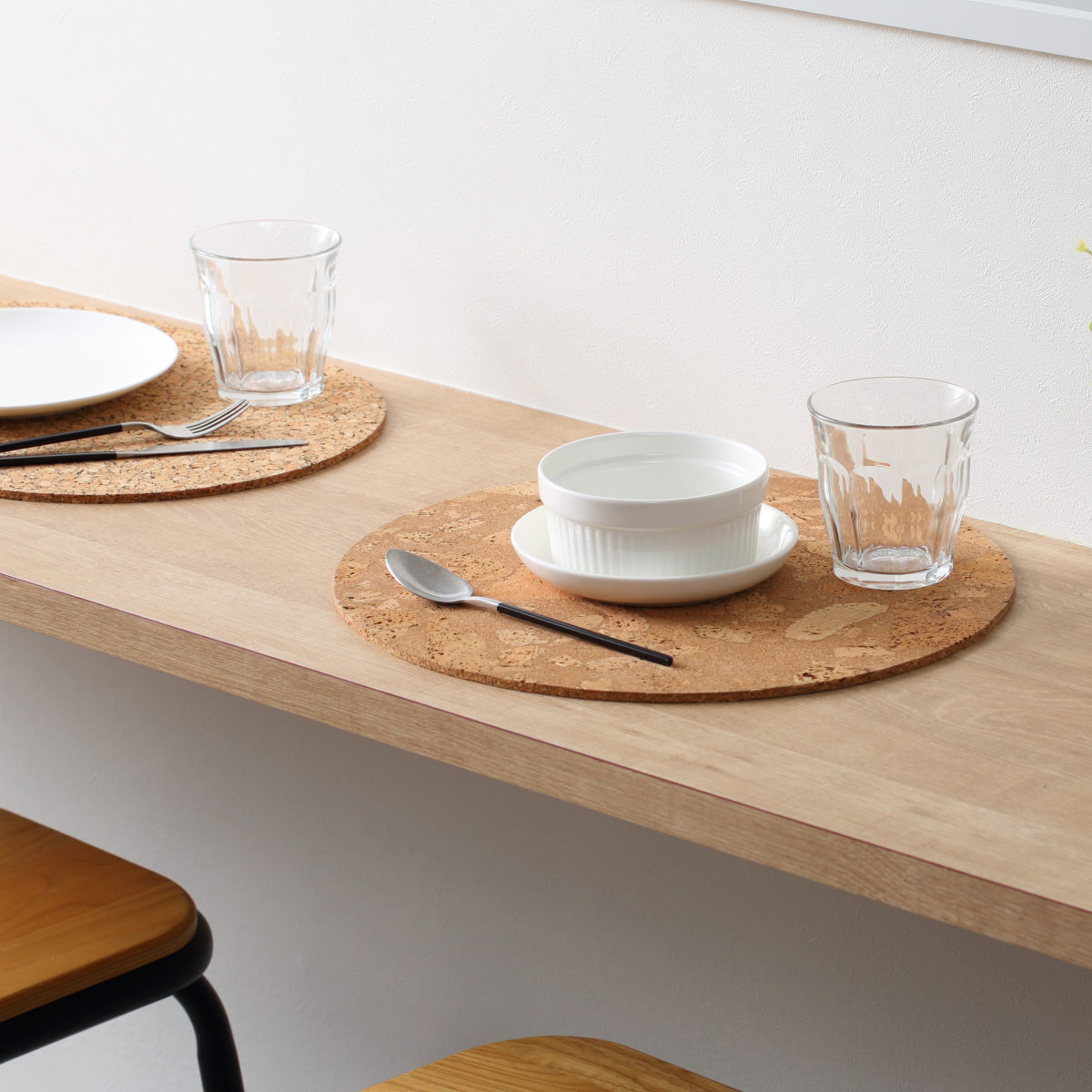 コルクは衝撃吸収性があるので、テーブルを傷や汚れから守り、グラスやお皿を置くときの音を和らげます。さらに耐熱性にも優れているので、熱々のお皿や鍋も安心して置くことができます。