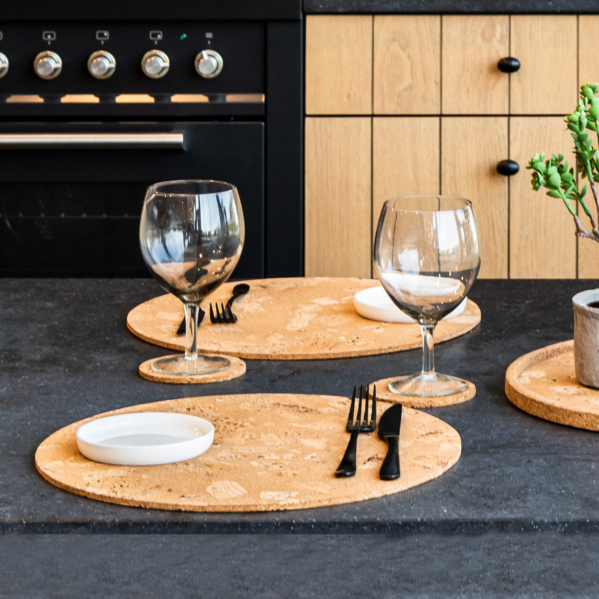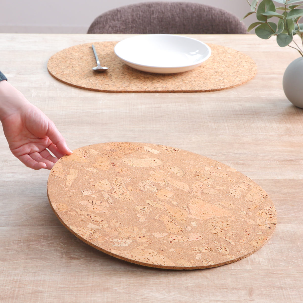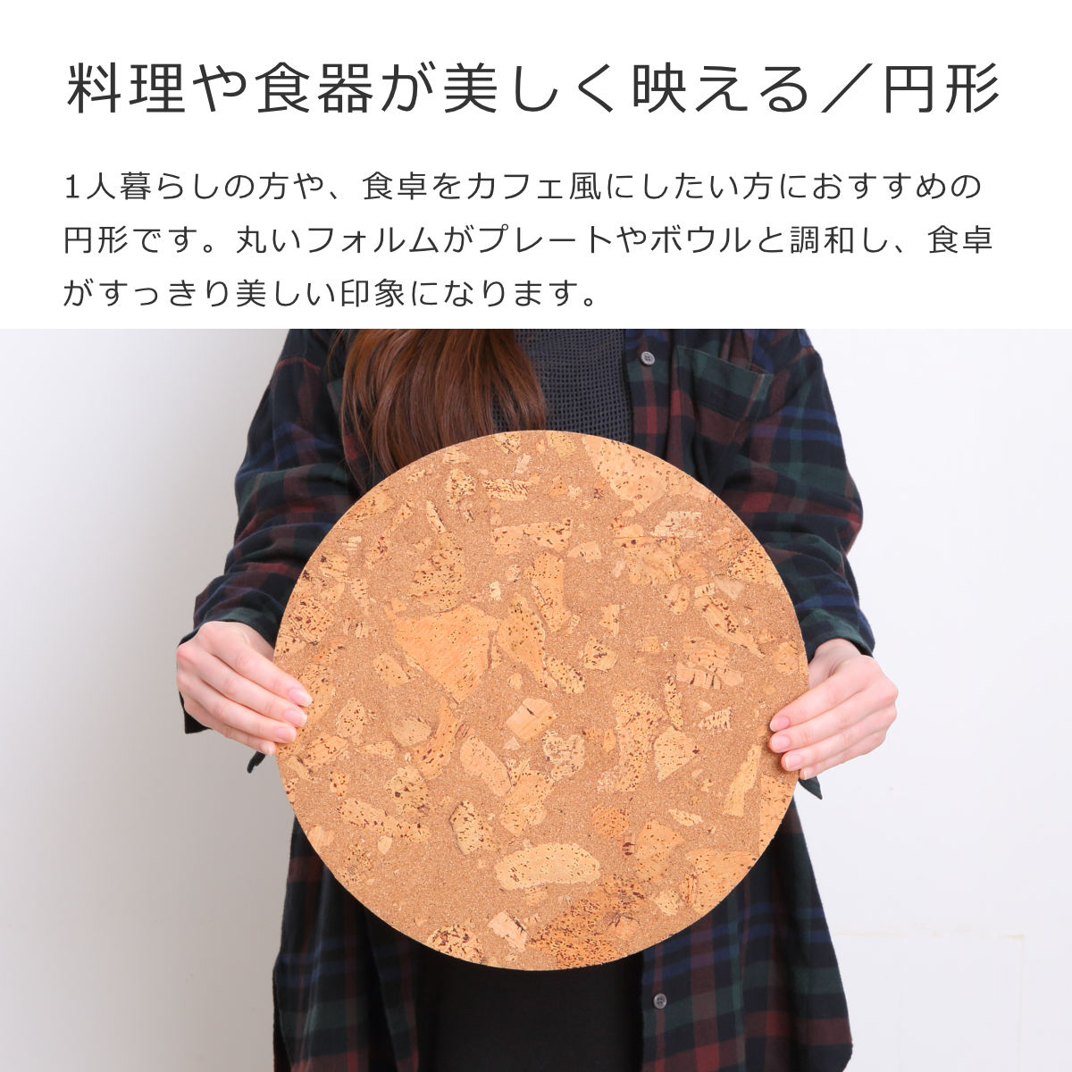 コルクは衝撃吸収性があるので、テーブルを傷や汚れから守り、グラスやお皿を置くときの音を和らげます。さらに耐熱性にも優れているので、熱々のお皿や鍋も安心して置くことができます。
