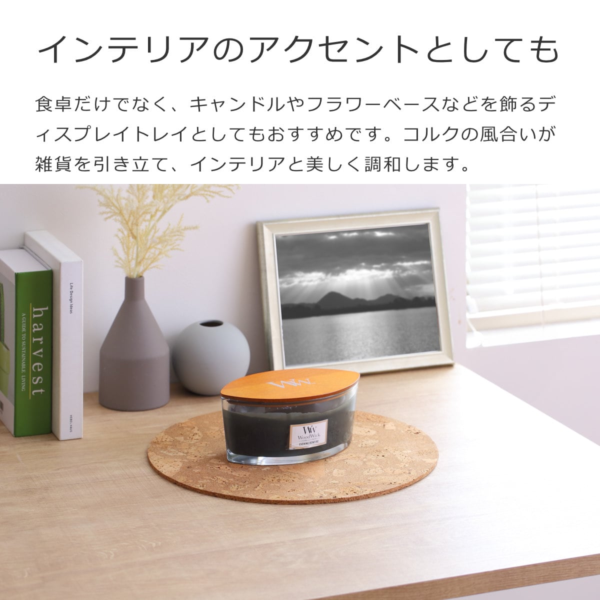 食卓だけでなく、キャンドルやフラワーベースなどを飾るディスプレイトレイとしてもおすすめです。コルクの風合いが雑貨を引き立て、木・陶器・ガラスなど上質な素材にも美しく調和します。