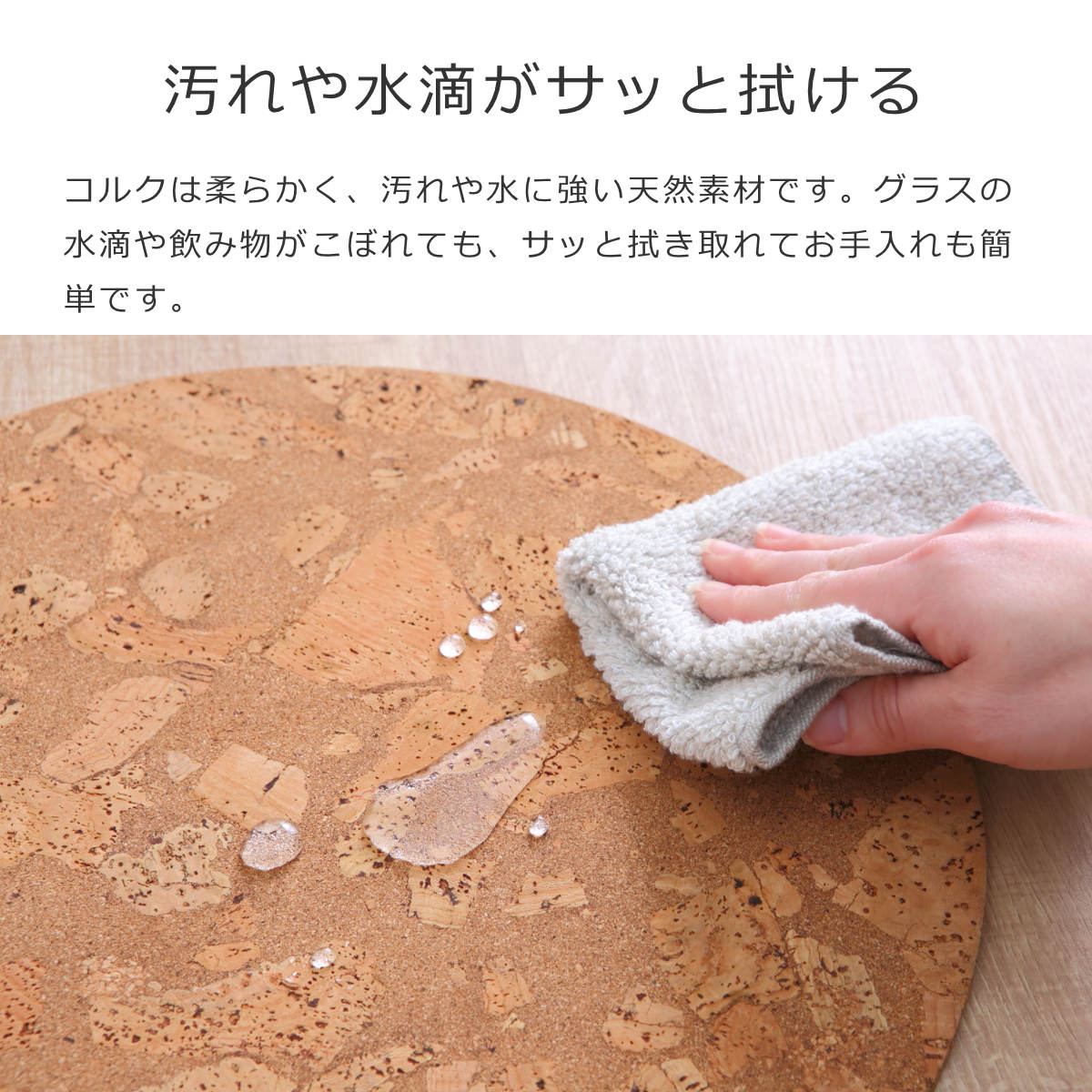 コルクは柔らかく、汚れや水に強い天然素材です。グラスの水滴や飲み物がこぼれても、サッと拭き取れてお手入れも簡単です。
