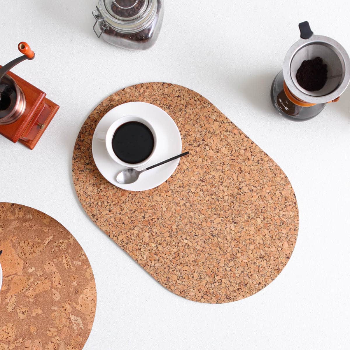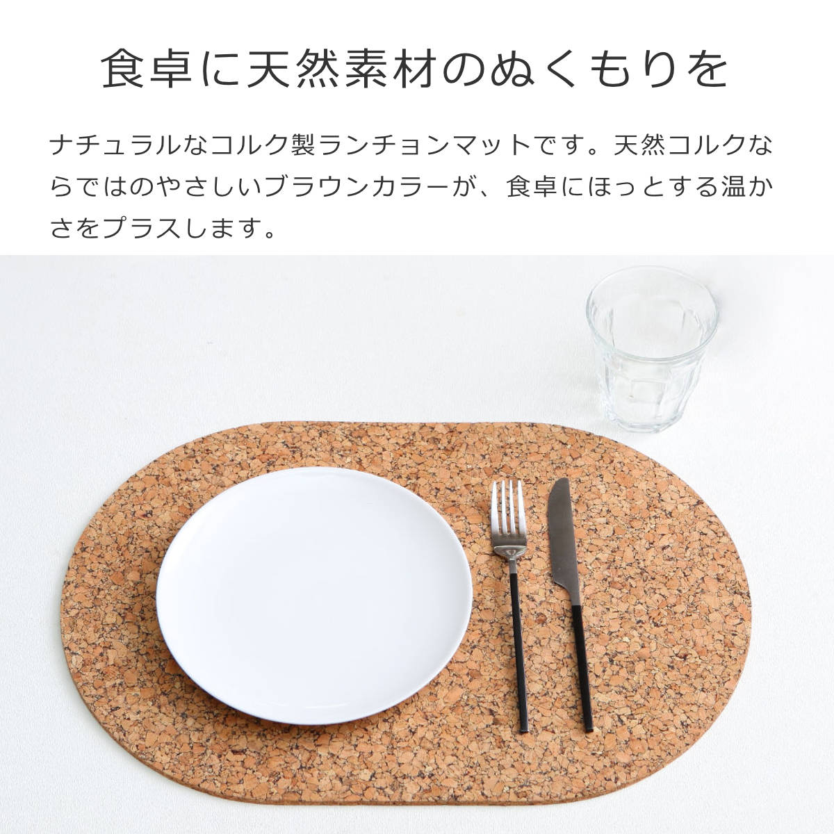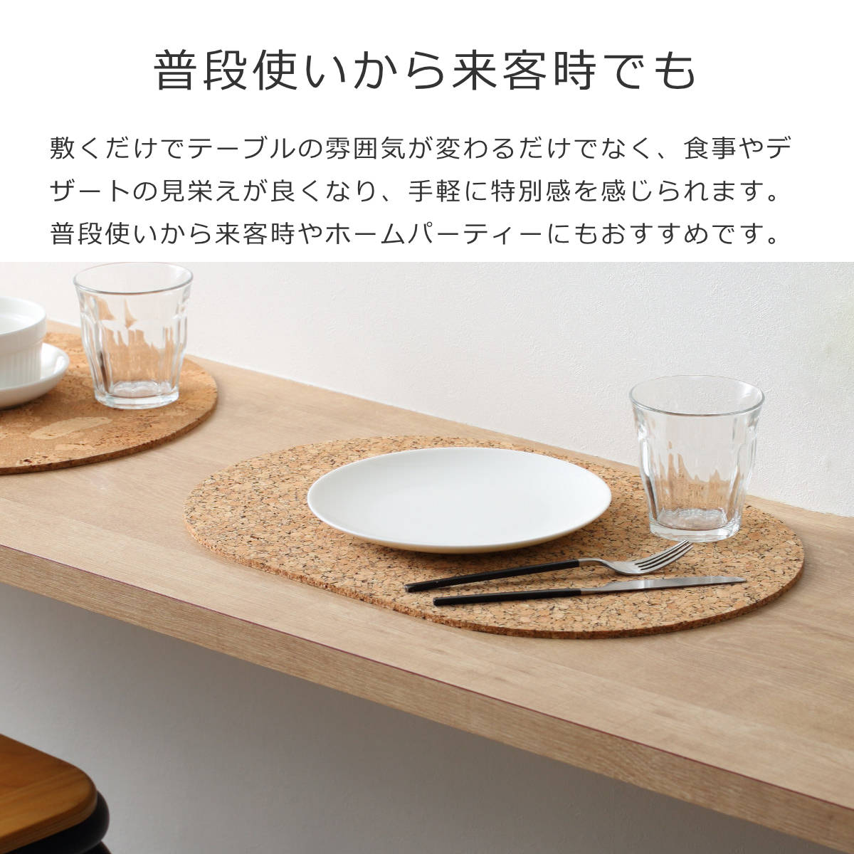 コルクは衝撃吸収性があるので、テーブルを傷や汚れから守り、グラスやお皿を置くときの音を和らげます。さらに耐熱性にも優れているので、熱々のお皿や鍋も安心して置くことができます。