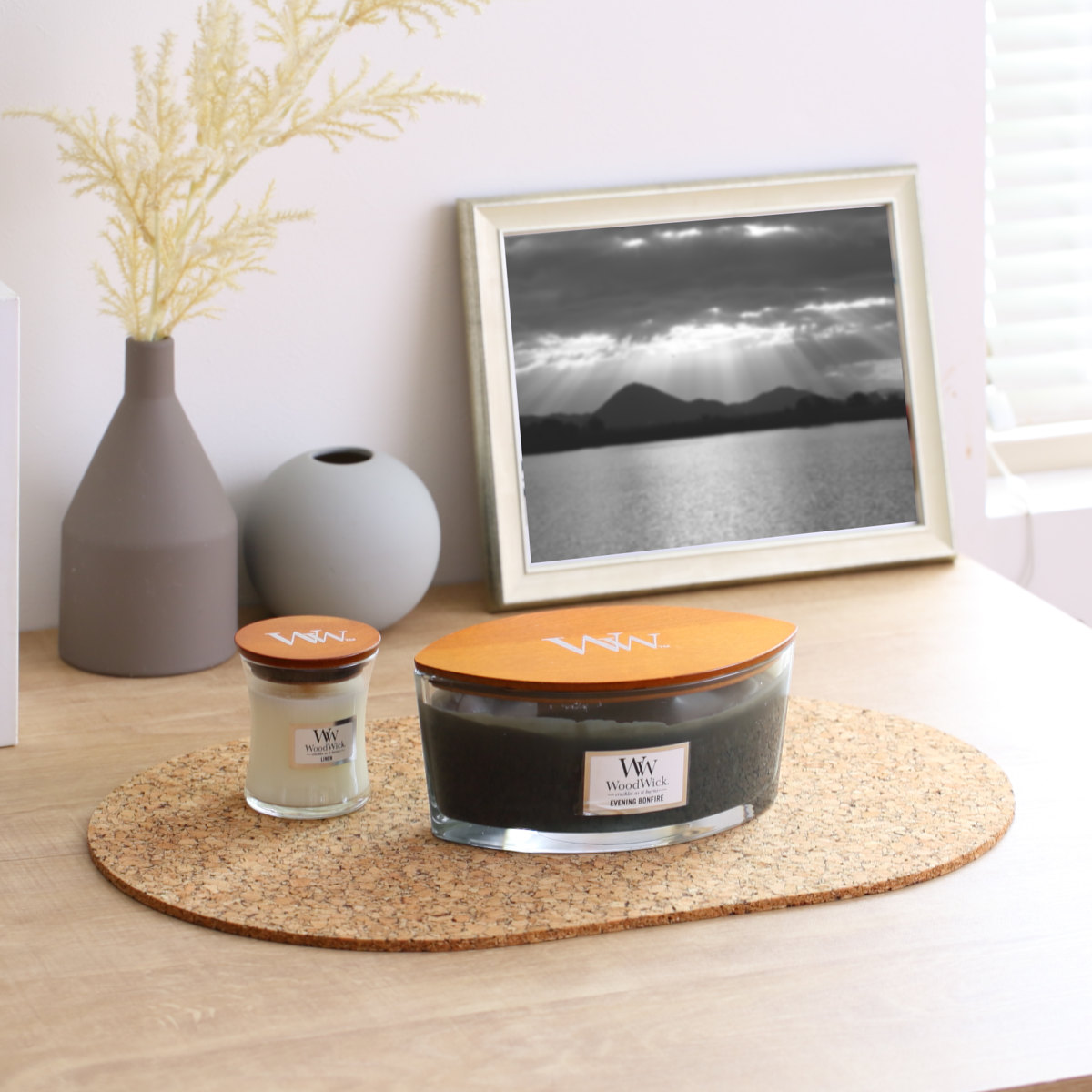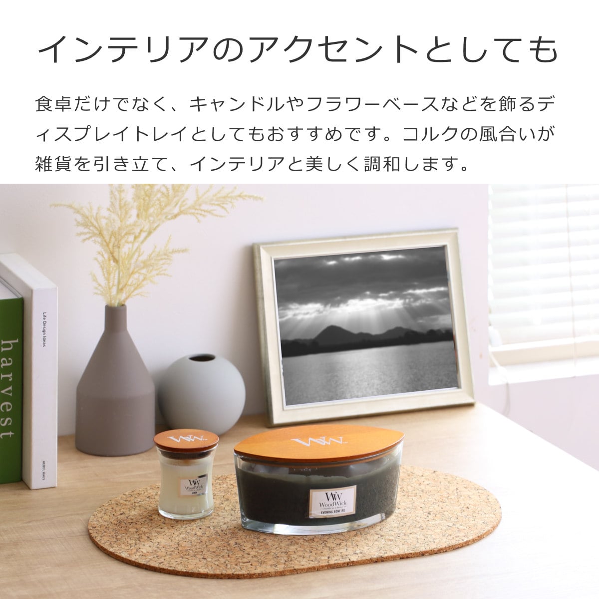 食卓だけでなく、キャンドルやフラワーベースなどを飾るディスプレイトレイとしてもおすすめです。コルクの風合いが雑貨を引き立て、木・陶器・ガラスなど上質な素材にも美しく調和します。