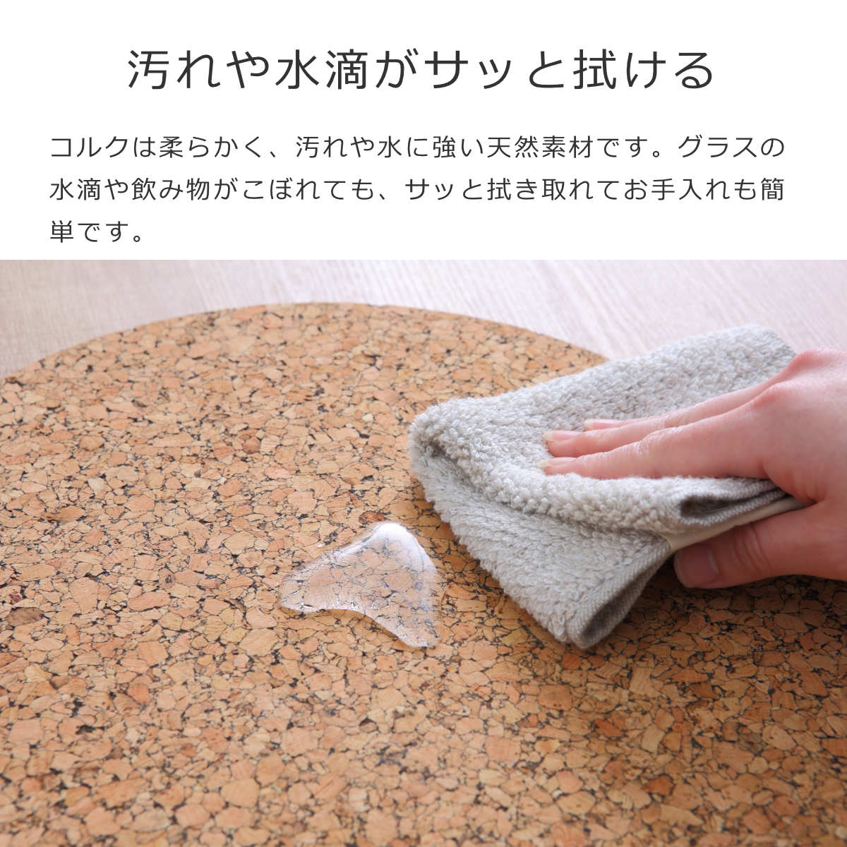 コルクは柔らかく、汚れや水に強い天然素材です。グラスの水滴や飲み物がこぼれても、サッと拭き取れてお手入れも簡単です。
