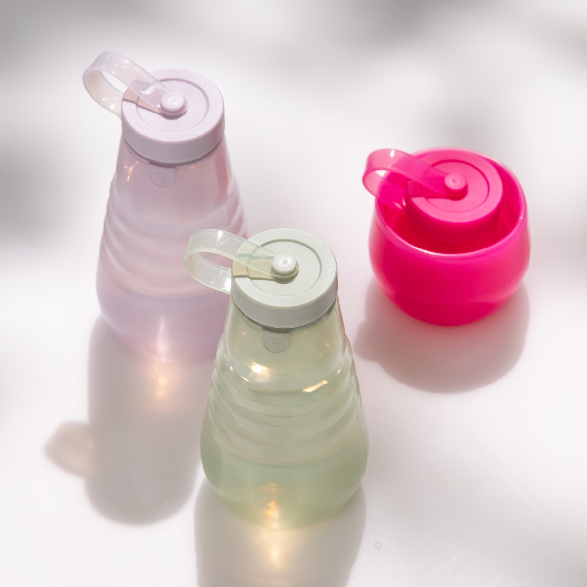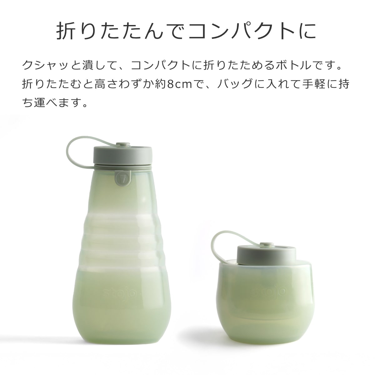 クシャッと潰して、コンパクトに折りたためるボトルです。折りたたむと高さわずか約8cmで、小さいバッグやポーチにも入るサイズです。マイボトルとしてバッグに入れて持ち歩けばエコで節約にも。
