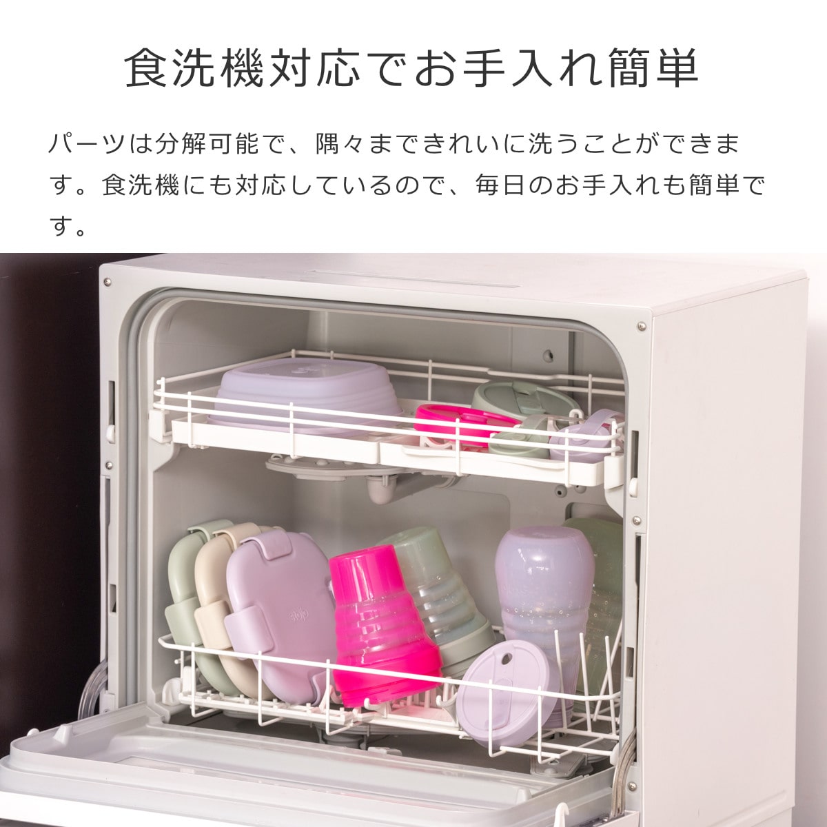 パーツ類は取り外して丸洗いが可能です。食洗機にも対応しているので、毎日のお手入れも簡単です。