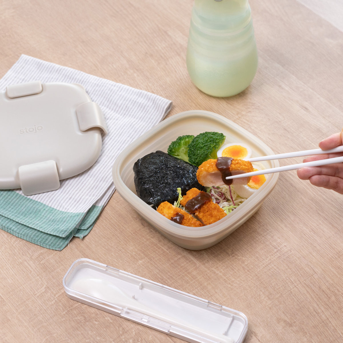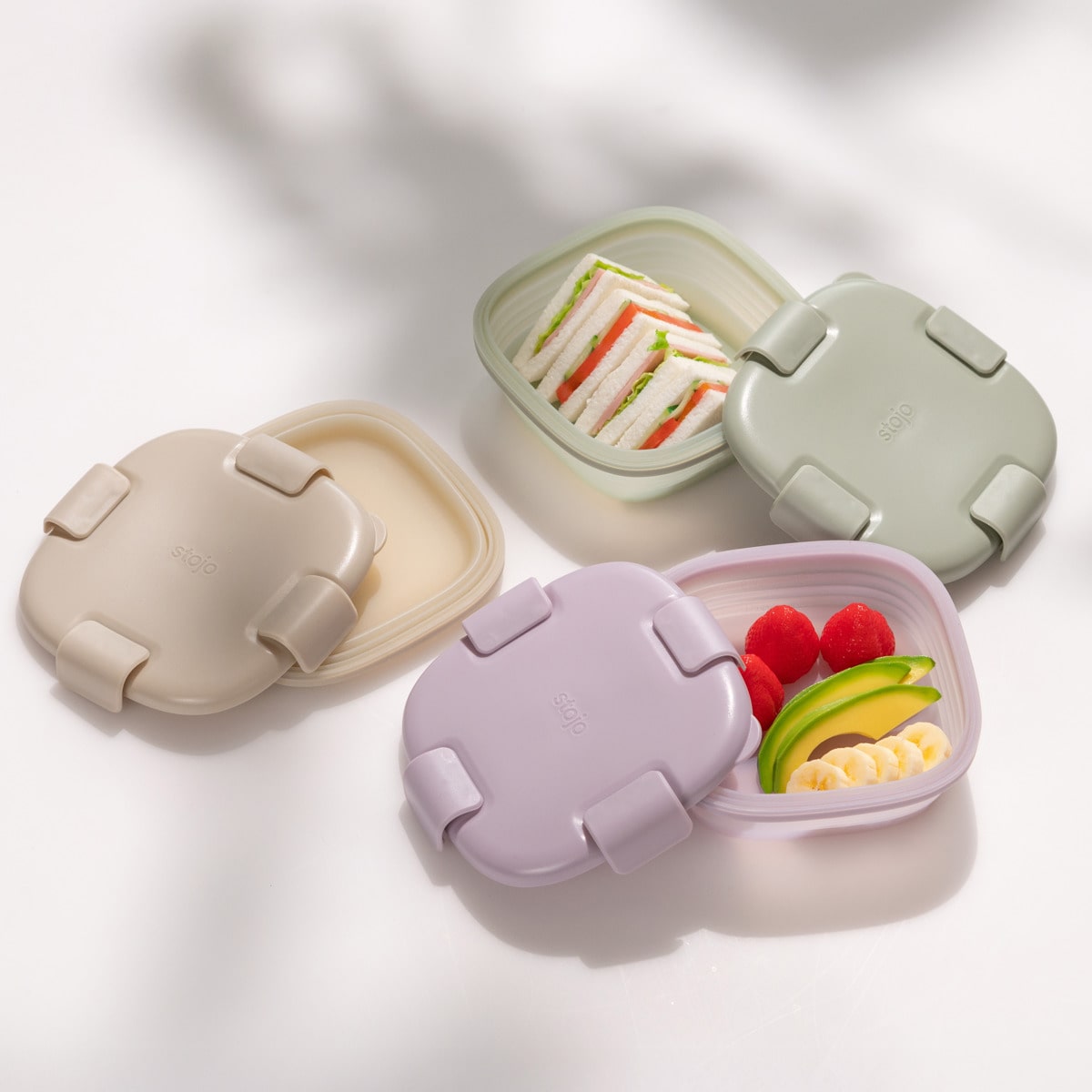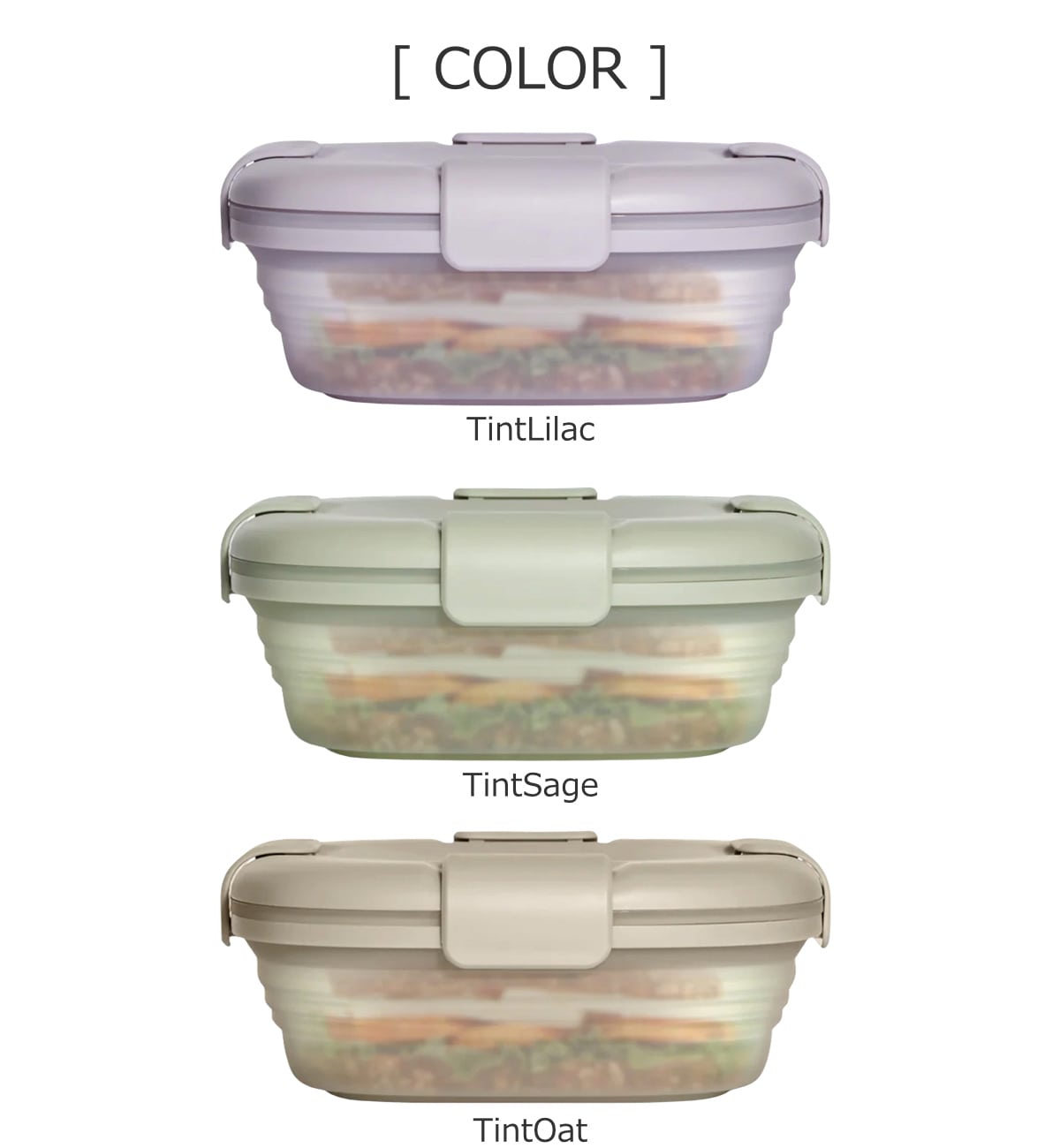 折りたためば高さわずか2.5cmと薄くコンパクトになるランチボックス。軽くて柔らかいシリコーン素材で、フタを外してペタンと潰すだけで簡単に折りたためて、食後も場所を取らずスマートに持ち運べます。