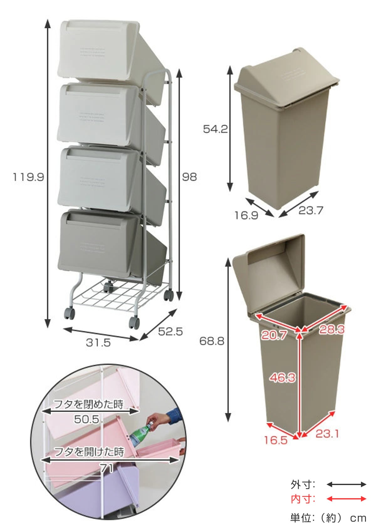 | サイズ | 約 幅31.5×奥行52.5×高さ119.9(cm) ゴミ箱:約 幅23.7×奥行16.9×高さ54.2(cm) |