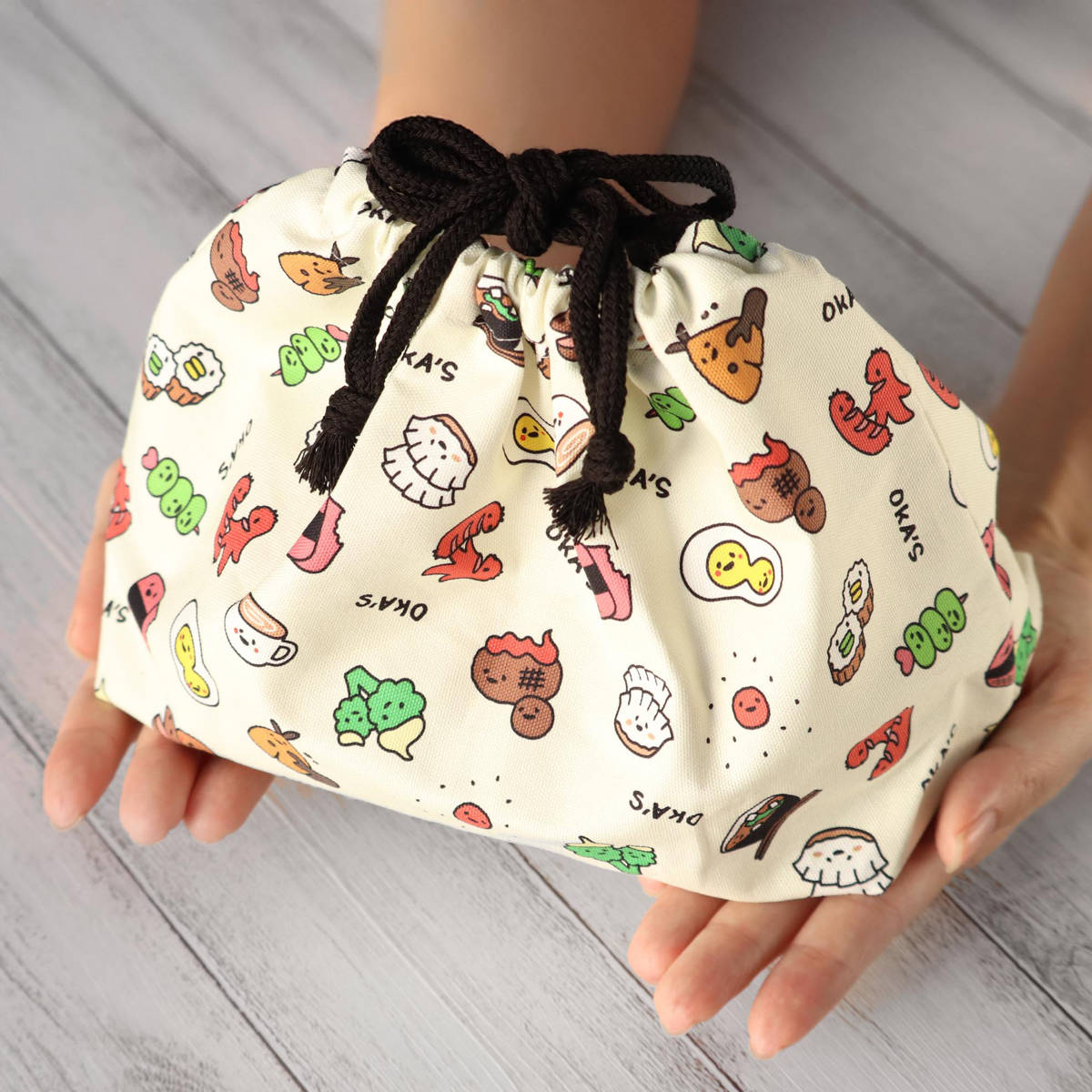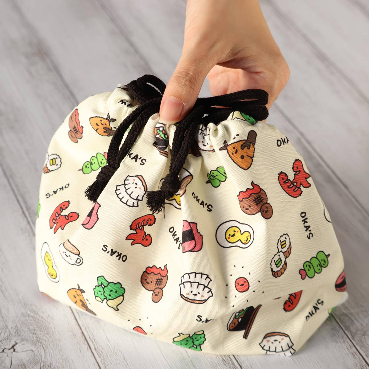 ランチタイムを楽しくしてくれる、オカズ柄のイラストがユニークなお弁当袋です。テンションも上がって、お昼からの仕事や勉強もはかどりそうですね。友達にも自慢したくなっちゃうかも!
