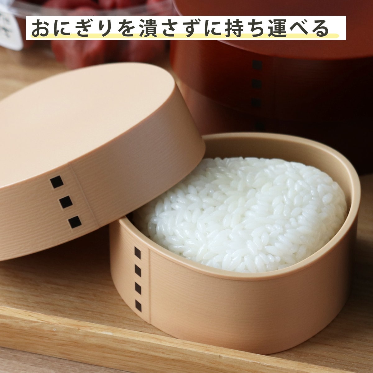 人気の「わっぱ弁当」が手のひらサイズのおにぎりケースに! ぬくもりを感じる、曲げわっぱ風デザインのおにぎりケースです。