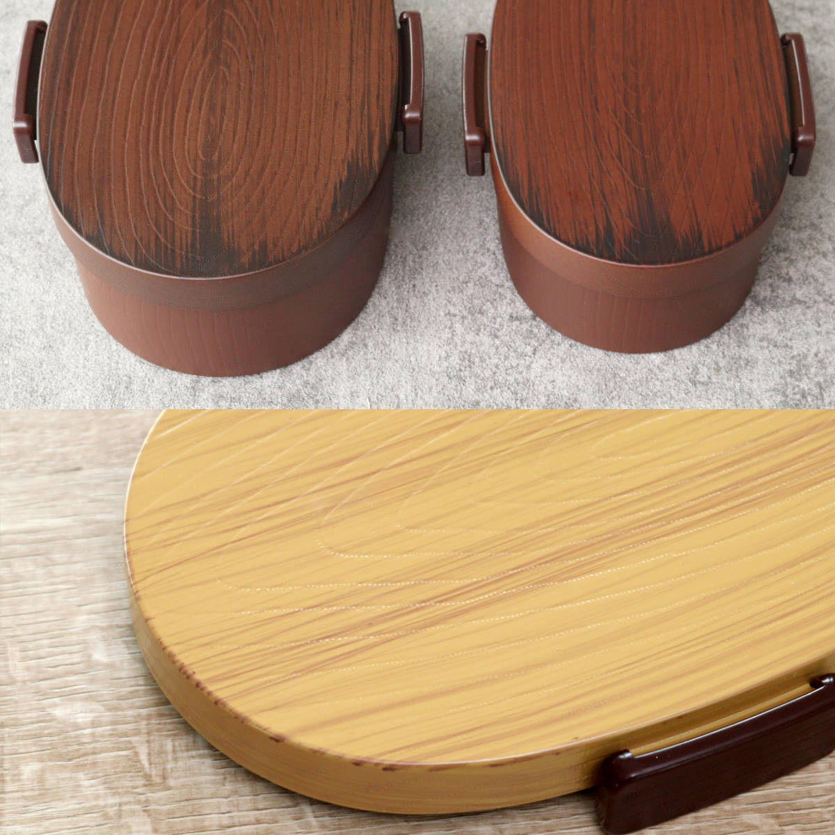 お手入れや扱いが難しそうな、曲げわっぱとは違い樹脂製で木目調のお弁当箱。少しハードルを下げて曲げわっぱ風のお弁当箱で毎日の家事を少しラクに。飽きのこないデザイン、なぜかいつもと同じお弁当でも美味しそうに見えます。