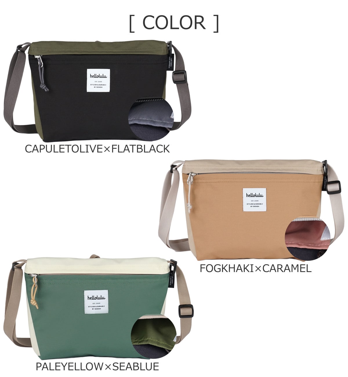 | 種類 | CAPULETOLIVE×FLATBLACK、FOGKHAKI×CARAMEL、PALEYELLOW×SEABLUE |