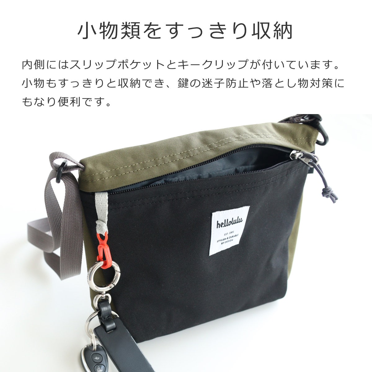 内側にはスリップポケットとキークリップが付いています。小物もすっきり収納でき、鍵の迷子防止や落とし物対策にもなります。