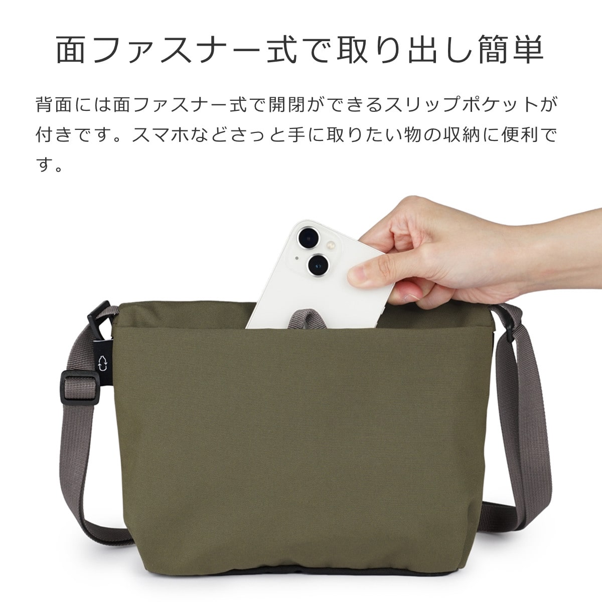 背面には面ファスナーで簡単に開閉可能なスリップポケットが付いています。スマホなどさっと手に取りたい物の収納に便利です。