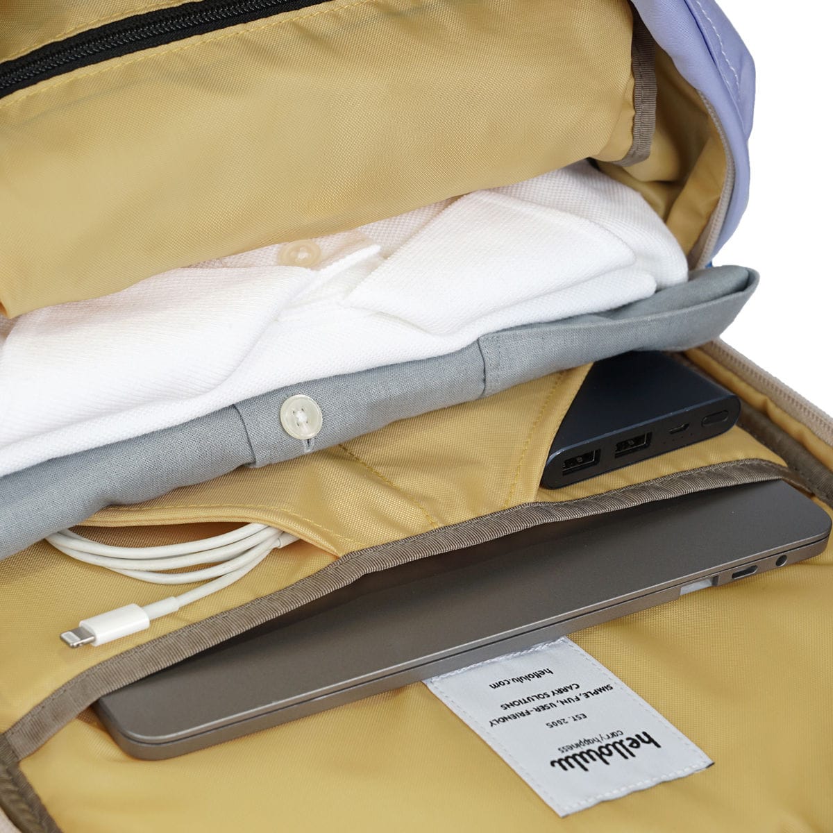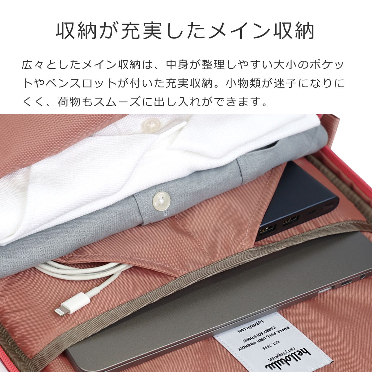 広々としたメイン収納は、中身が整理しやすい大小のポケットやペンスロットが付いた充実収納。小物類が迷子になりにくく、荷物もスムーズに出し入れができます。パット入りのPCポケットは、14インチのPCまで対応可能です。