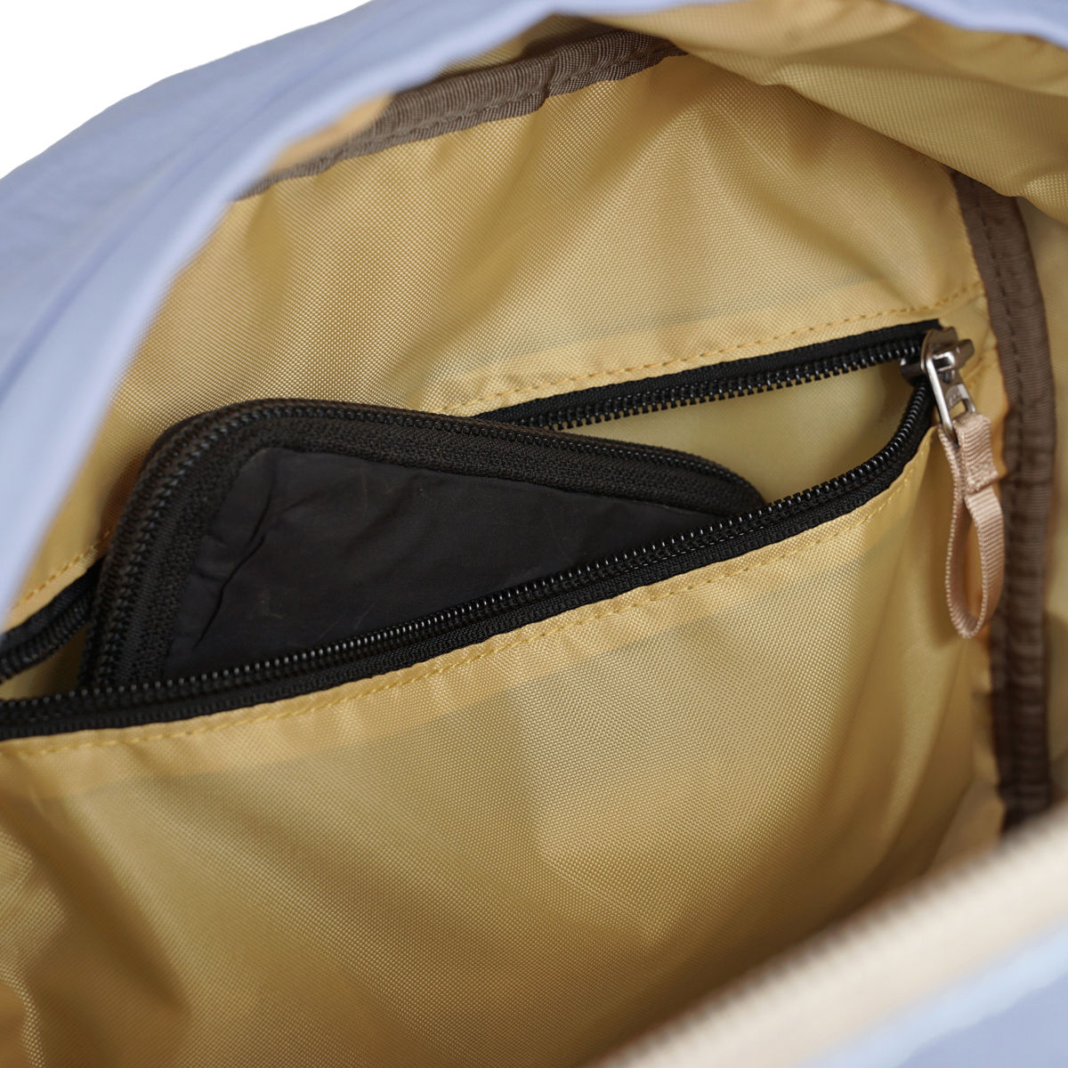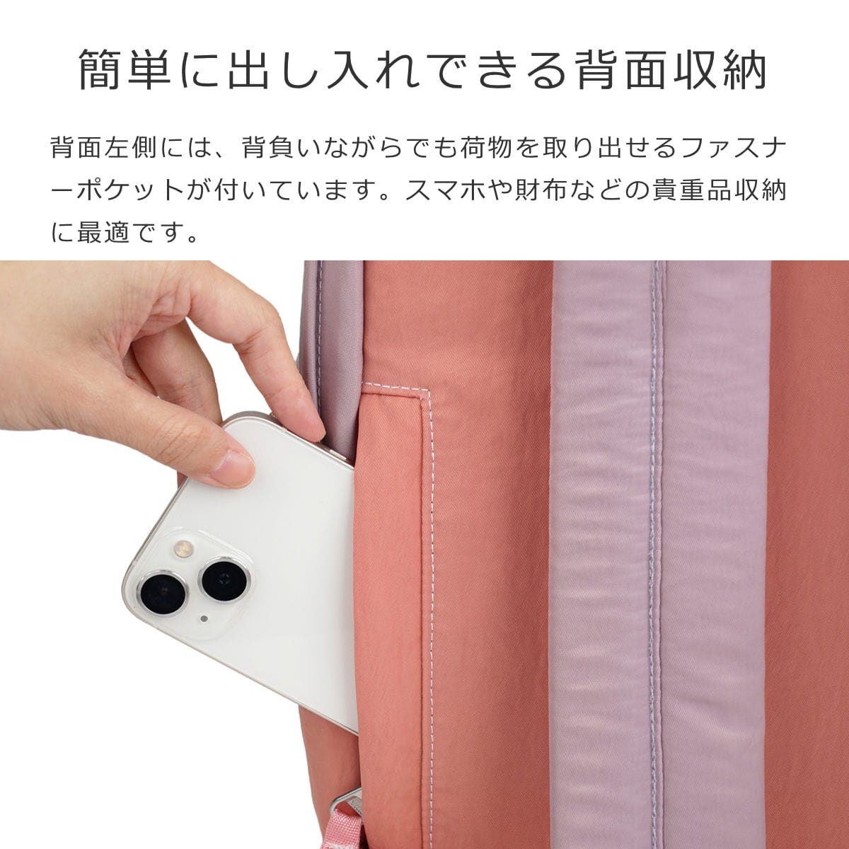 背面左側には、背負いながらでも荷物を取り出せるファスナーポケットが付いています。スマホや財布などの貴重品収納に最適です。