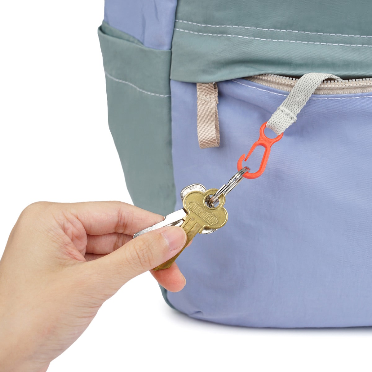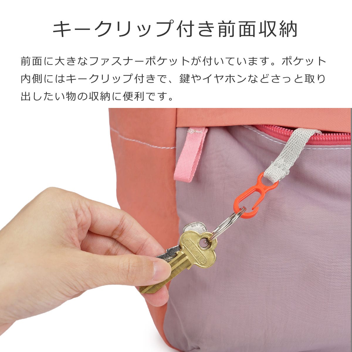 前面に大きなファスナーポケット付き。ポケット内側にはキークリップ付いており、鍵やイヤホンなどさっと取り出したい物の収納に便利です。