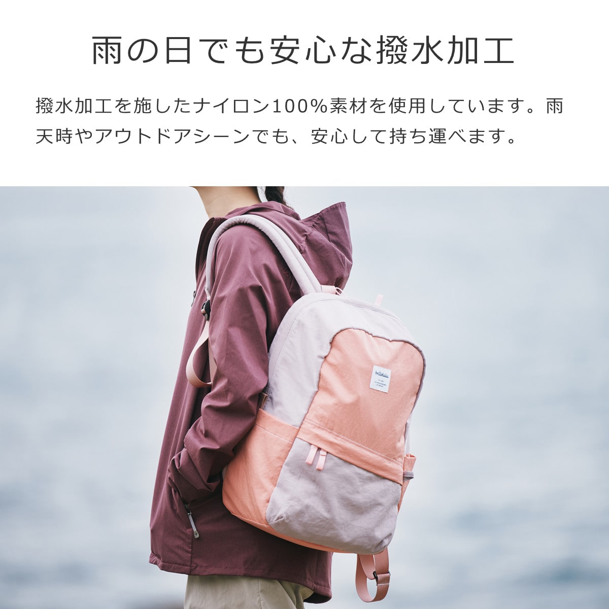 撥水加工を施したナイロン100%素材を使用しています。雨天時やアウトドアシーンでも、安心して持ち運べます。