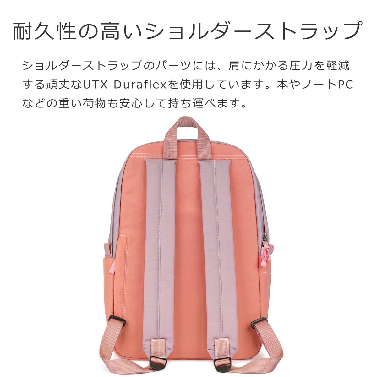 調節可能なショルダーストラップには、肩にかかる圧力を軽減する頑丈なUTX Duraflexアクセサリーが装備。本やノートPCなど、重い荷物を入れても肩への負担を軽減できます。