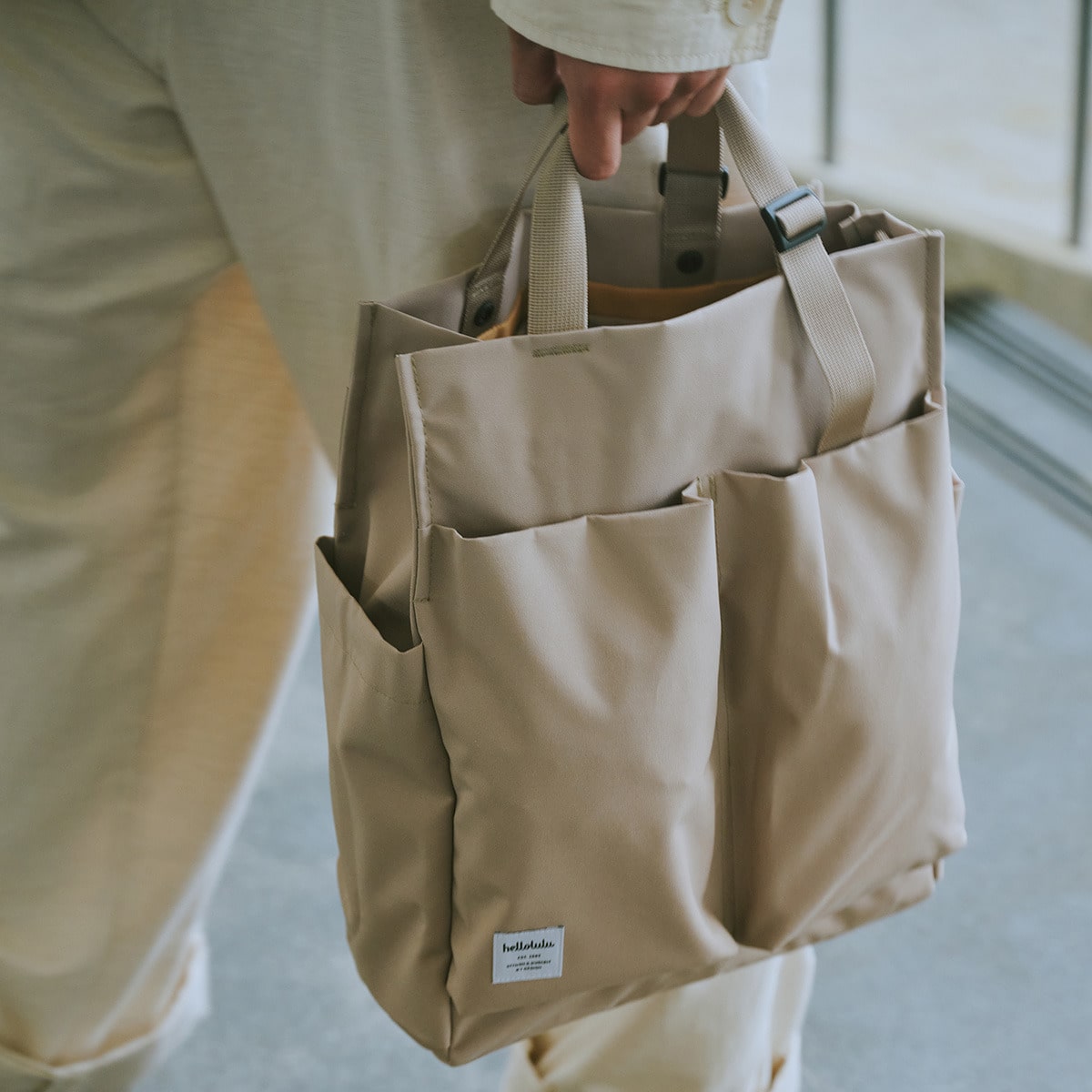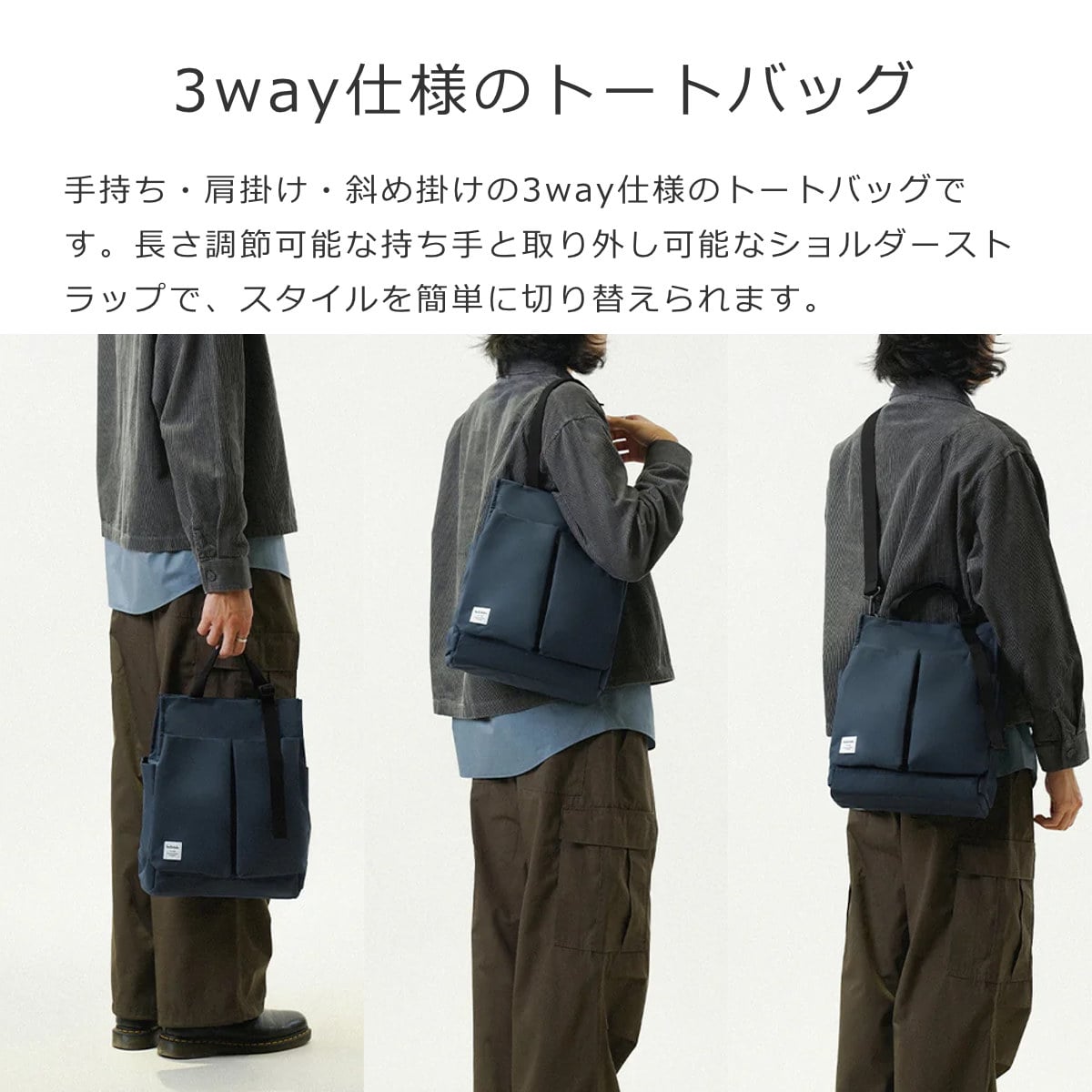 手持ち・肩掛け・斜め掛けの3way仕様のトートバッグ。長さ調節可能な持ち手と取り外し可能なショルダーストラップで、シーンに合わせてスタイルを変えられます。書類や水筒などが収納しやすい縦型で、機能的なポケットが沢山付いているので、通勤・通学に最適です。