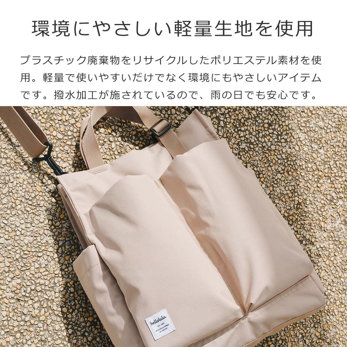 プラスチック廃棄物をリサイクルしたポリエステル素材を使用しています。軽量で使いやすいだけでなく環境にもやさしいアイテムです。撥水加工が施されているので、雨の日でも安心です。