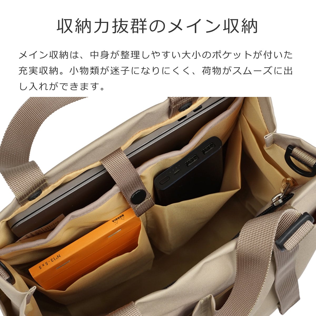 メイン収納は、中身が整理しやすい大小のポケットが付いた充実収納。小物類が迷子になりにくく、荷物もスムーズに出し入れができます。ノートPCが入るポケットにはパット入りなので、大切なPCや書類もしっかりと守ります。