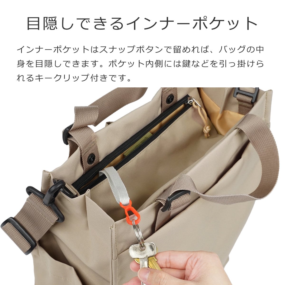インナーポケットはスナップボタンで留めれば、バッグの中身を目隠しできます。ポケット内側には鍵などを引っ掛けられるキークリップ付きです。