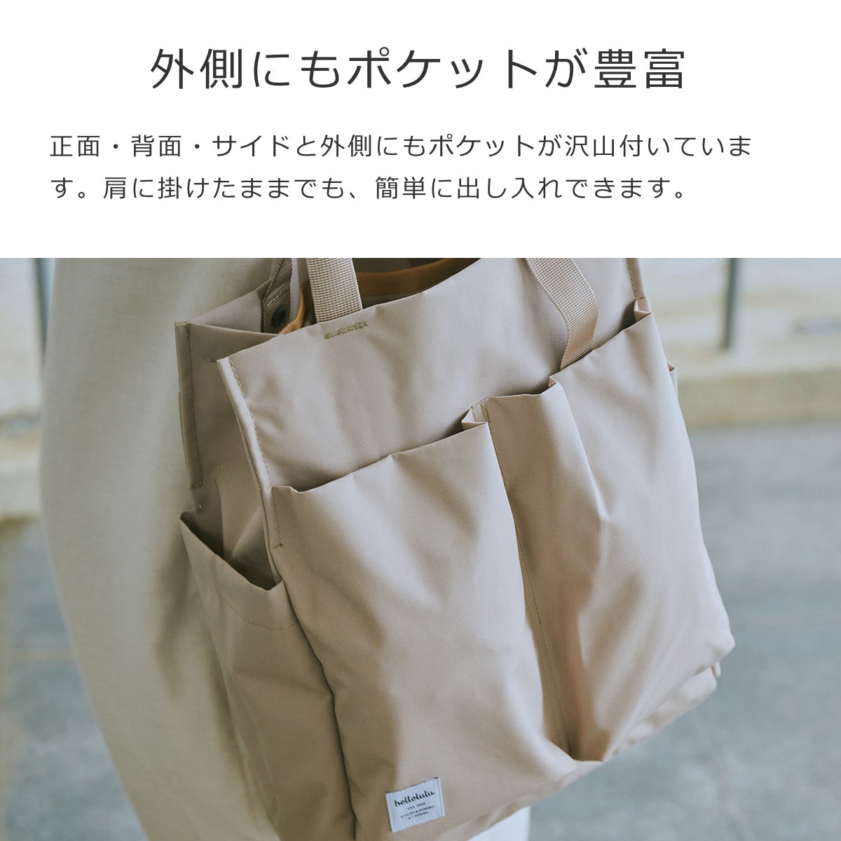 両サイドには水筒や折り畳み傘がすっぽり収まる、深めのポケットが付いています。肩に掛けたままでも、簡単に出し入れできます。