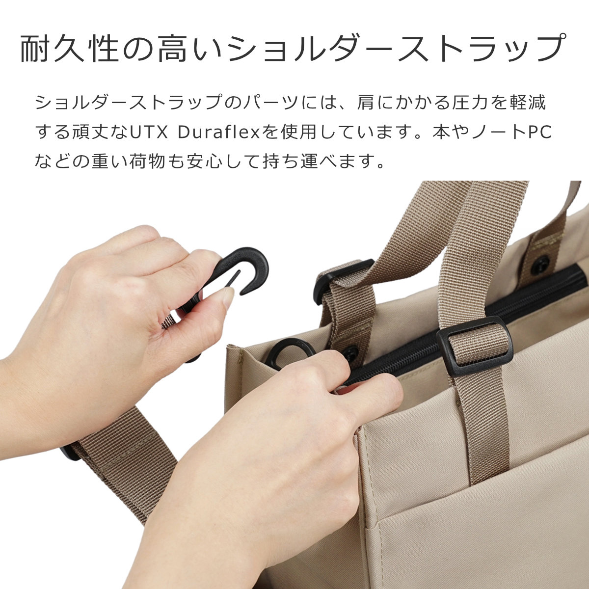 ショルダーストラップのパーツには、肩にかかる圧力を軽減する頑丈なUTX Duraflexを使用。本やノートPCなどの重い荷物も安心して持ち運べます。