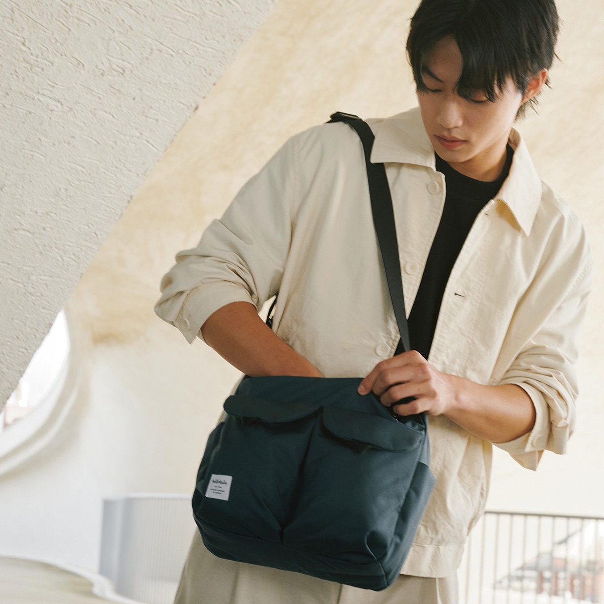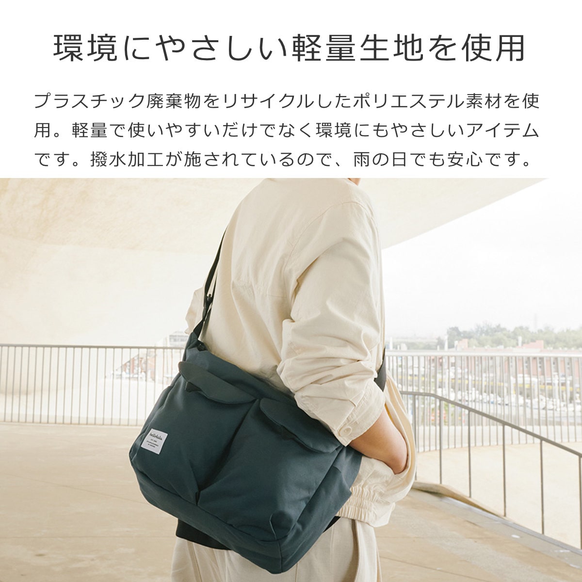 プラスチック廃棄物をリサイクルしたポリエステル素材を使用しています。軽量で使いやすいだけでなく環境にもやさしいアイテムです。撥水加工が施されているので、雨の日でも安心です。