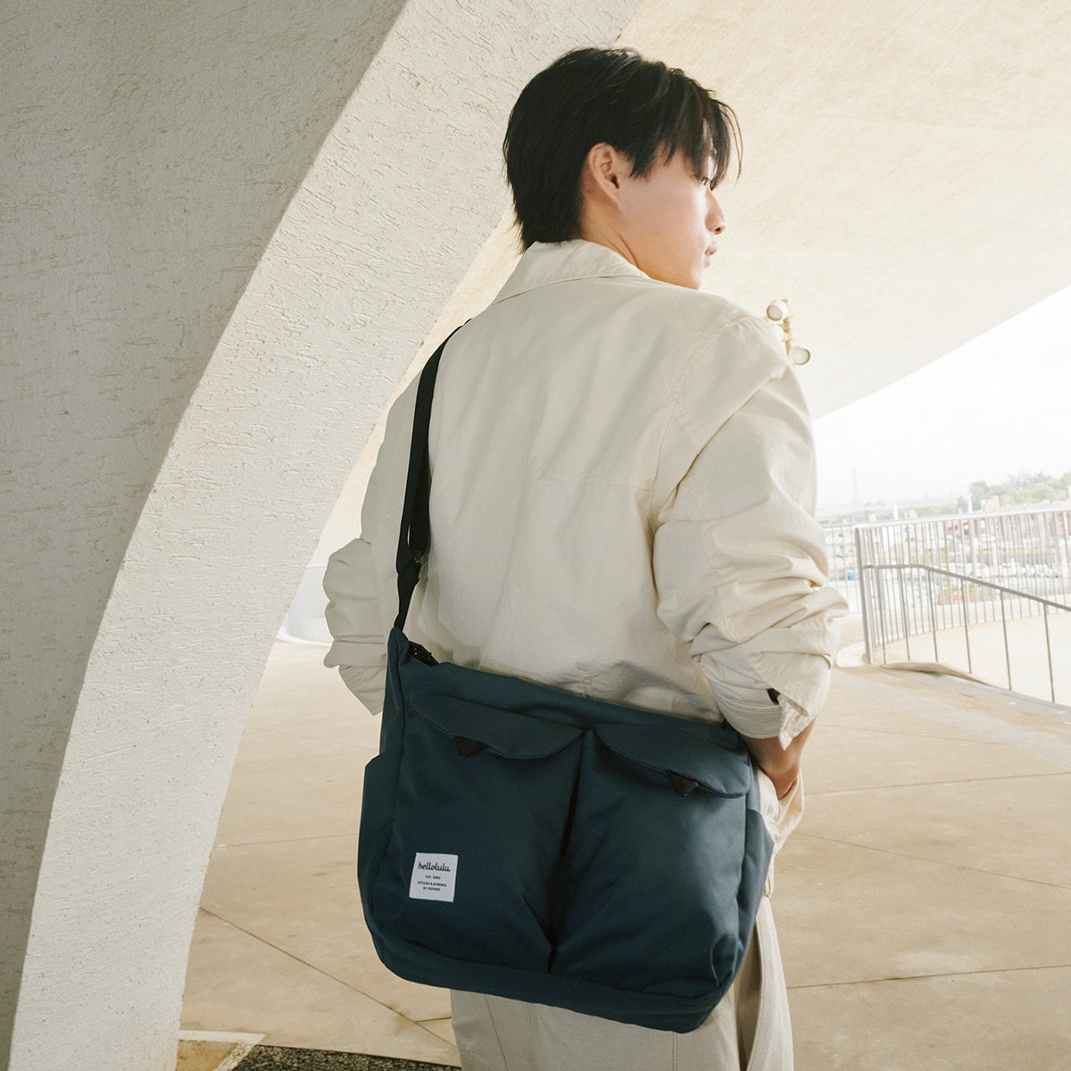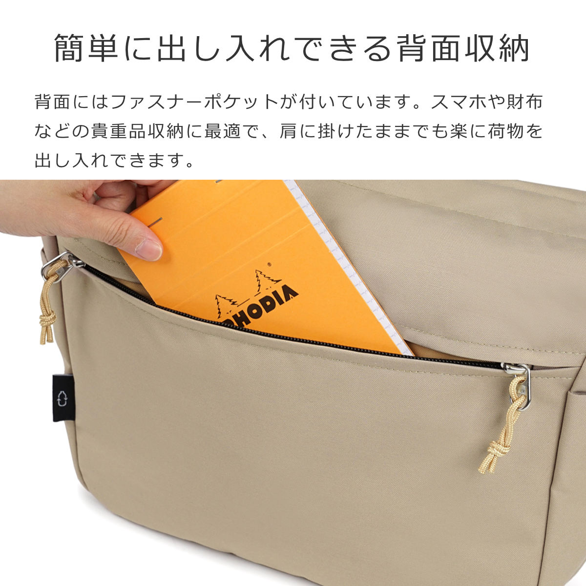 背面にもファスナーポケットが付いています。スマホや財布などの貴重品収納に最適で、肩に掛けたままでも荷物をすぐ取り出せます。