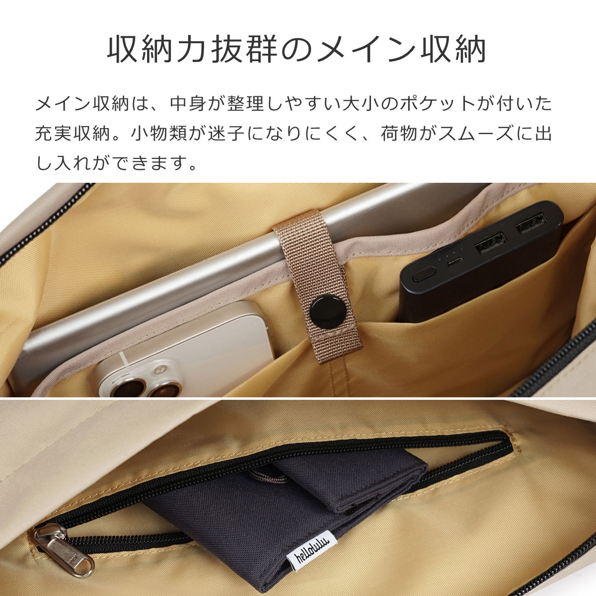 メイン収納は、中身が整理しやすい大小のポケットが付いた充実収納。小物類が迷子になりにくく、荷物もスムーズに出し入れができます。タブレットが入るポケットにはパット入りなので、大切なPCや書類もしっかりと守ります。
