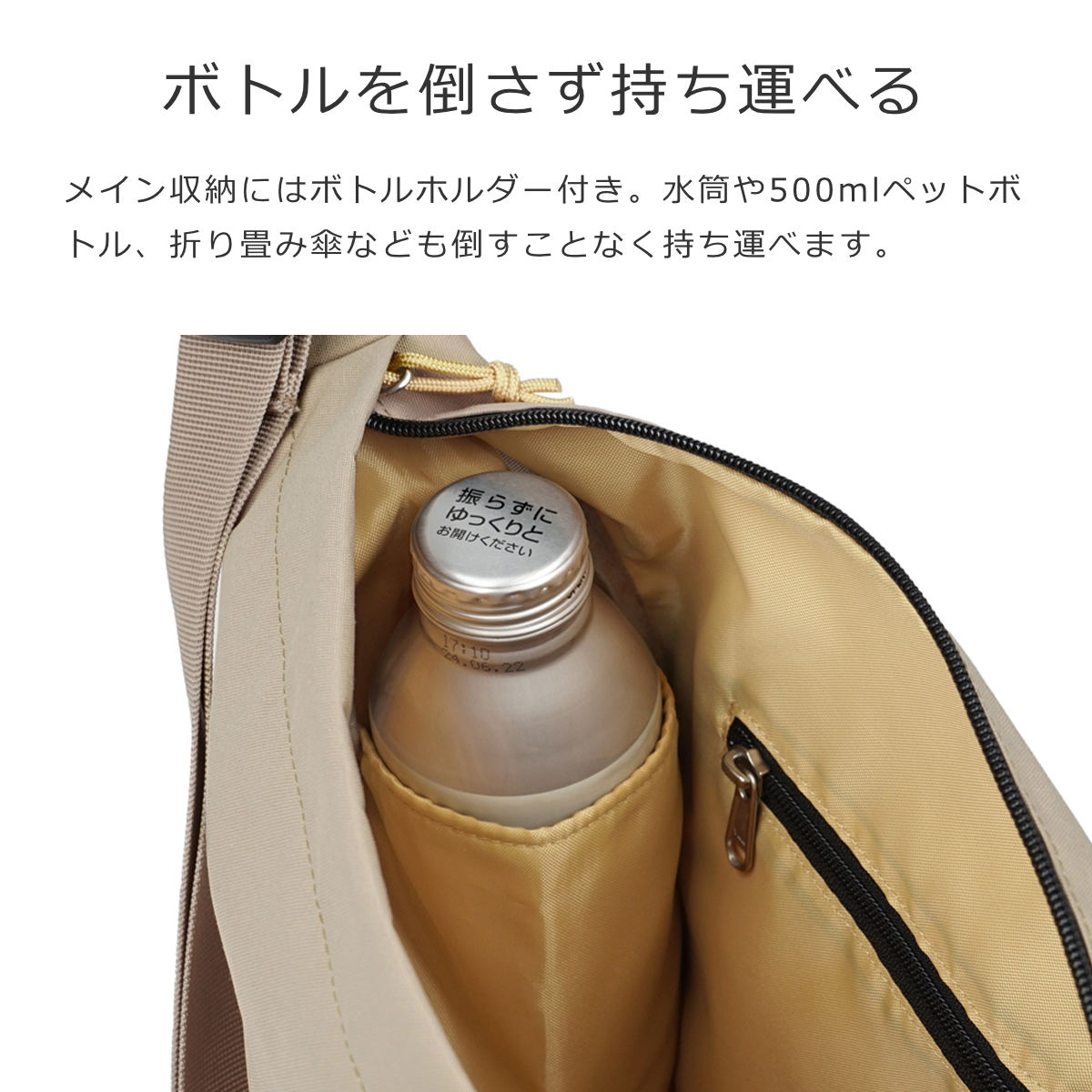 メイン収納にはボトルホルダー付きで、水筒や500mlペットボトルなどを倒すことなく持ち運べます。