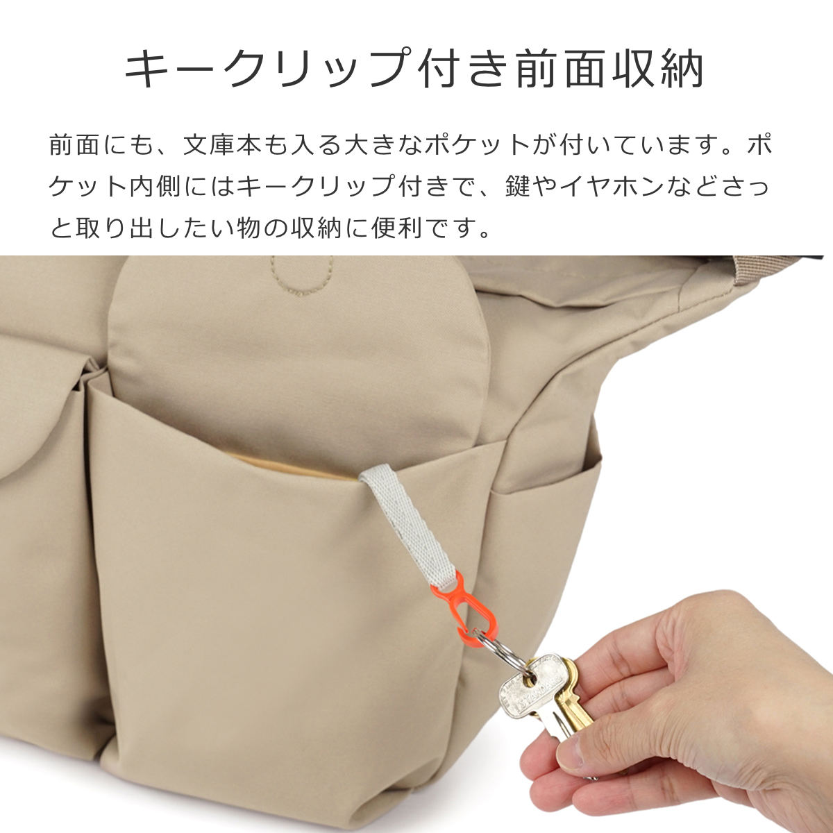 前面にはマグネット留めの大容量ポケットが2つ付いており、ハンドクリームやイヤホンなどの小物をすぐ取り出せます。ポケット片側には鍵などを引っ掛けられるキークリップ付きです。